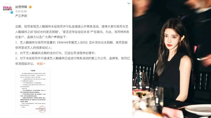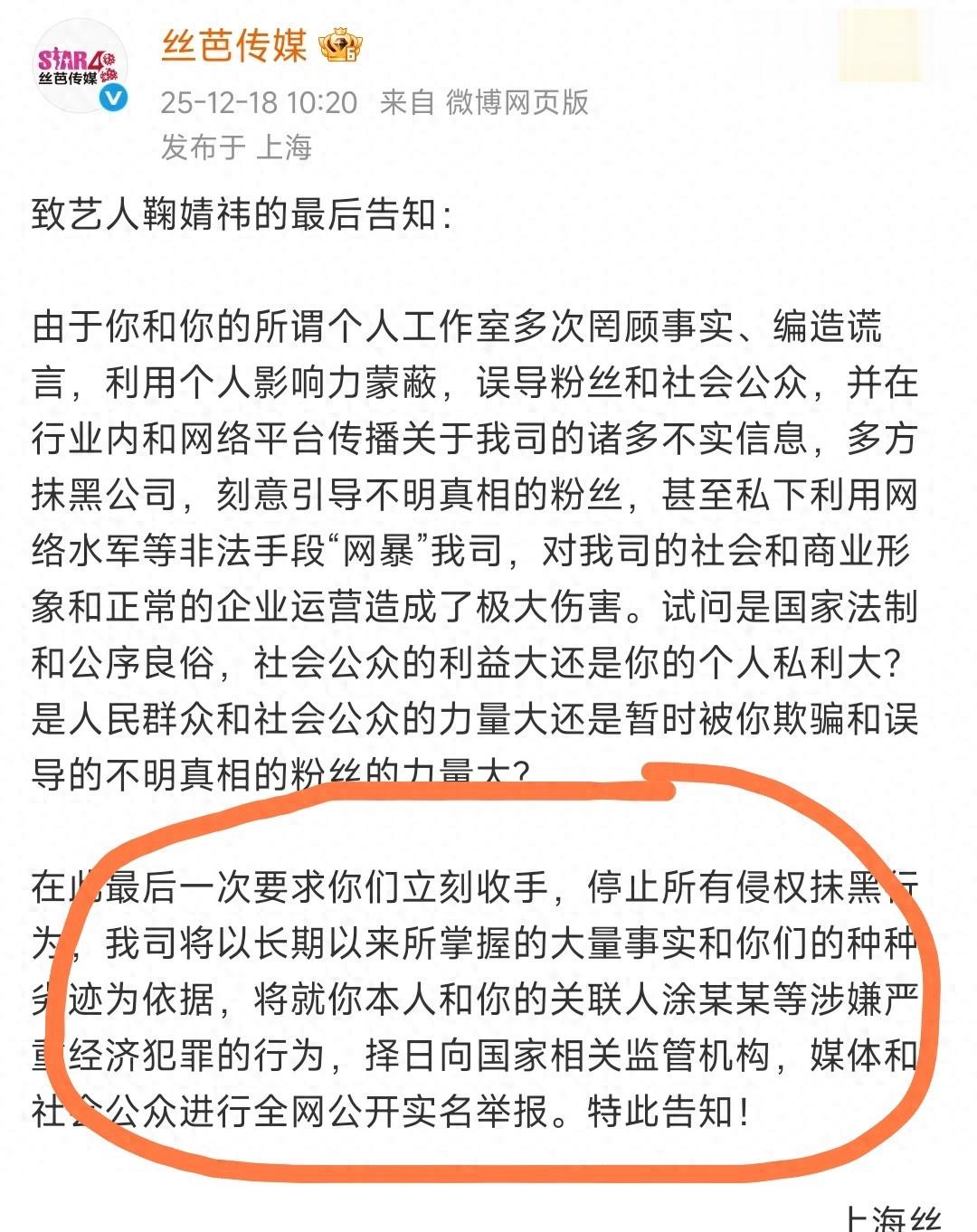 12月18日,鞠婧祎的老东家丝芭传媒发出一纸“最后告知”,白纸黑字地警告她及其关联人涂某某涉嫌触犯刑法,甚至扬言要向监管部门实名举报。