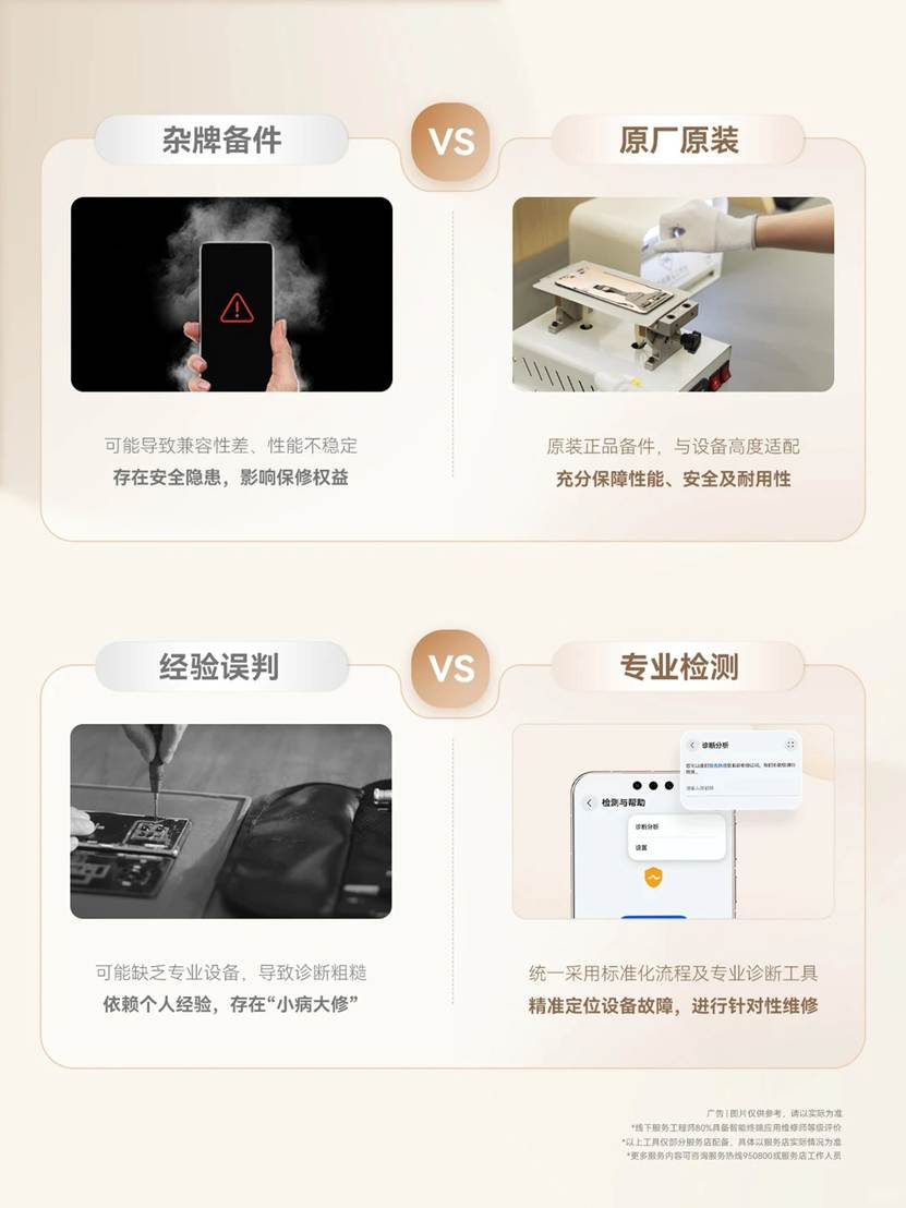 在专业能力上,第三方小店多是 “半路出家” 的维修人员,工具简陋、技术参差不齐,还常用来源不明的翻新件、劣质件,不仅修后易复发故障,还可能埋下安全隐患。而华为服务具备专业的服务团队和维修工具,华为线下服务工程师超80%具备智能终端应用维修师认证,配合自动化拆卸、压合与检测工具,实现高效高质量维修;同时,华为官方服务所有维修均具有官方品质保证,保障设备长期稳定运行。