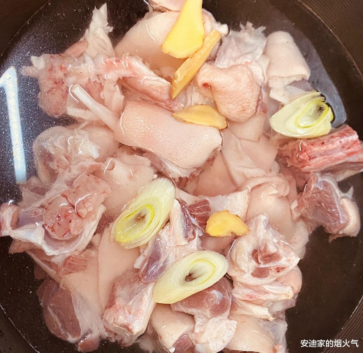 2. 猪蹄焯水:猪蹄块冷水下锅,加入2片姜和1汤匙料酒,大火煮开后撇去浮沫,继续煮3分钟,捞出用温水冲洗干净,沥干备用。