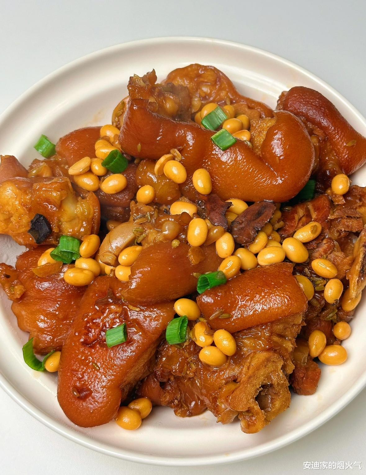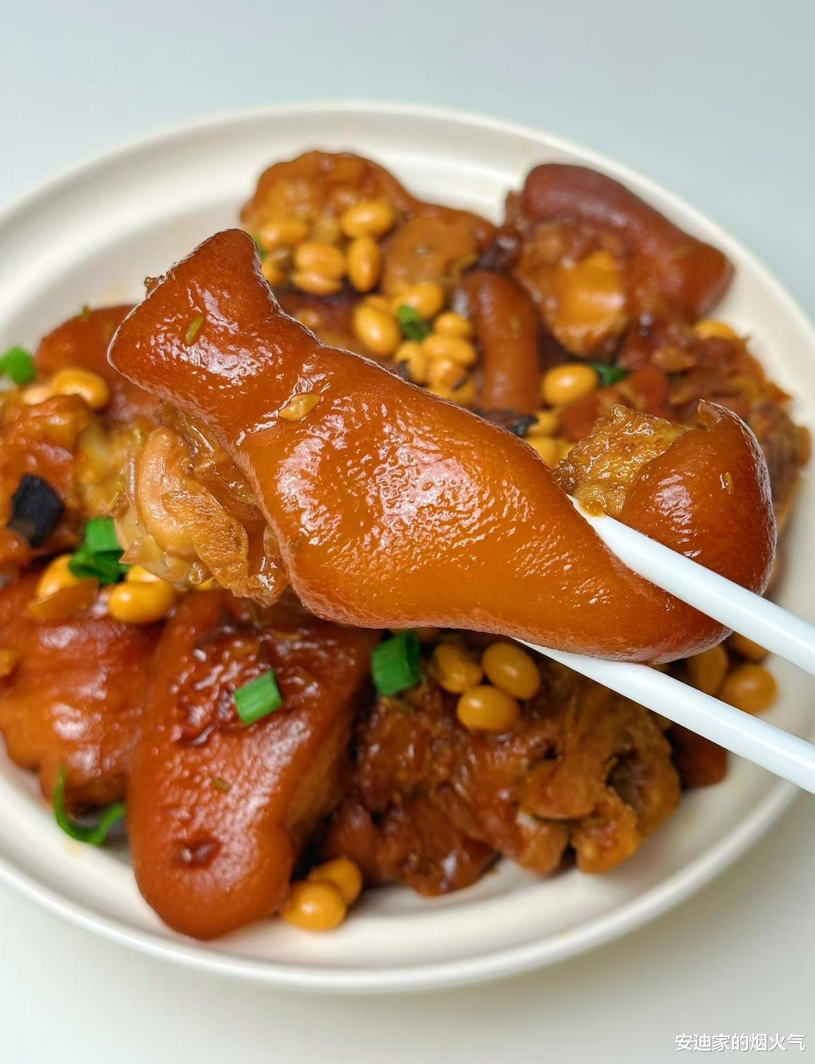 在慢火咕嘟的声响里,厨房渐渐漫开一股醇厚的香气,那是黄豆与猪蹄在砂锅里慢慢交融的味道。这道家常菜没有繁复的工序,却藏着最踏实的暖意——猪蹄炖得软烂脱骨,黄豆吸饱了肉汁变得粉糯绵密,每一口都是时光熬煮出的温柔。它不像宴席菜那般精致,却能在疲惫的日子里,用一碗浓香的汤汁,把心和胃都熨帖得妥妥当当。