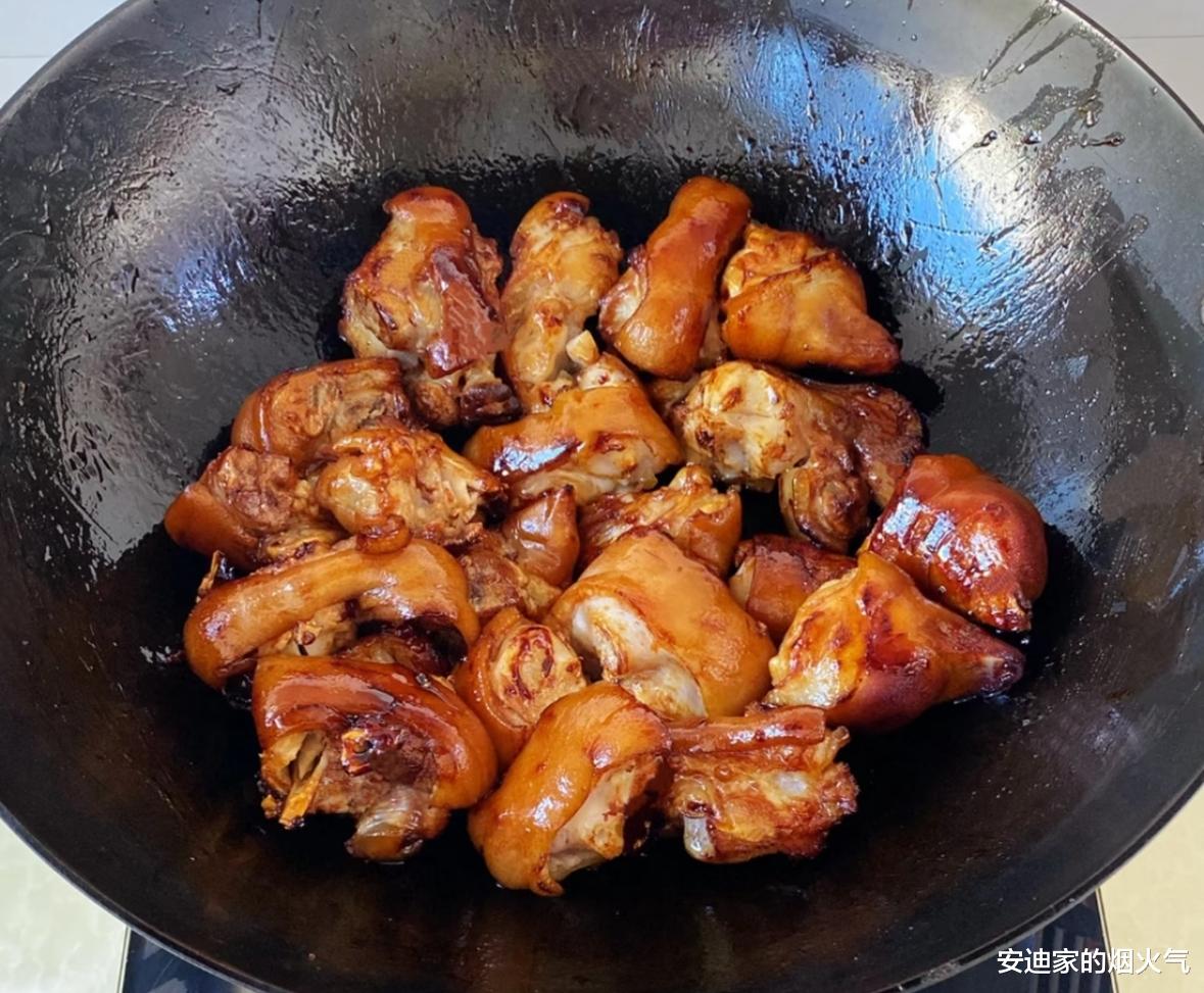 4. 翻炒上色:迅速倒入焯好水的猪蹄,快速翻炒,使每块猪蹄都均匀地裹上糖色。