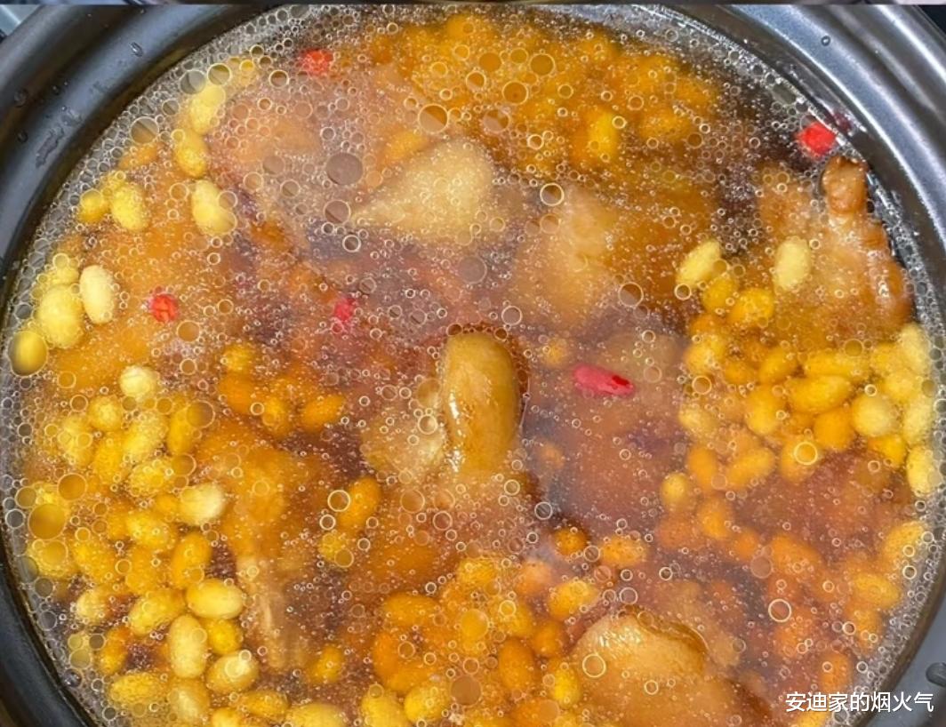 7. 加入黄豆:将泡发好的黄豆加入锅中,翻拌均匀,继续盖盖小火炖煮30-40分钟,直至猪蹄软烂、黄豆粉糯。