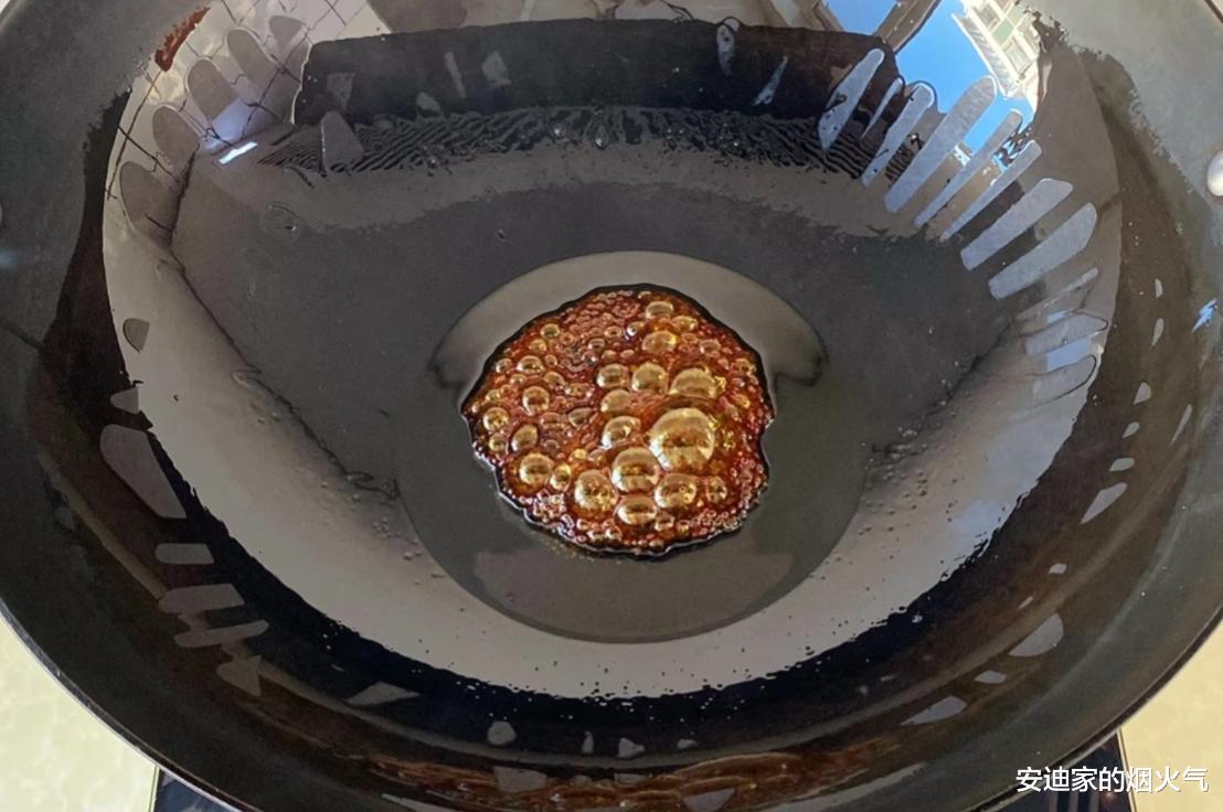 3. 炒糖色:锅中放少许油,下入冰糖,用小火慢慢炒至冰糖完全融化,并呈现枣红色,泛起细密小泡。