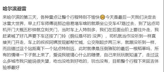 女生还在帖子中提到,她在这次东北之行中,感觉哈尔滨的体验相对较差,她特别指出,自己的帖子并未夸大其词,而是基于实际情况,将所遇到的情况如实叙述出来,给其他想要来旅游的人作个参考。