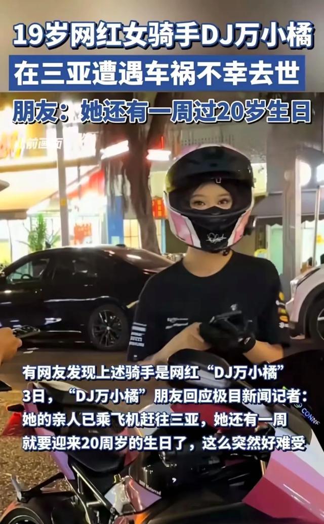 12月3日,据极目新闻报道,年仅19岁的机车网红“DJ万小橘”在三亚海棠区海南环岛旅游公路上发生车祸不幸去世。