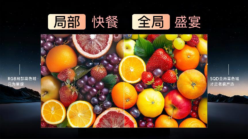 可以说,同样的画面,这对传统RGB-Mini LED电视形成了全方位碾压——RGB-Mini LED电视受制于底层逻辑缺陷,不是偏色就是串色,画面灰蒙蒙的毫无生气可言;但SQD-Mini LED电视却能做到每种色彩都通透、纯正,画面也极具质感与张力,隔着屏幕都能感受到那股鲜活感。可以说,全局,是终极解决方案;局部,只是色彩的折中妥协。