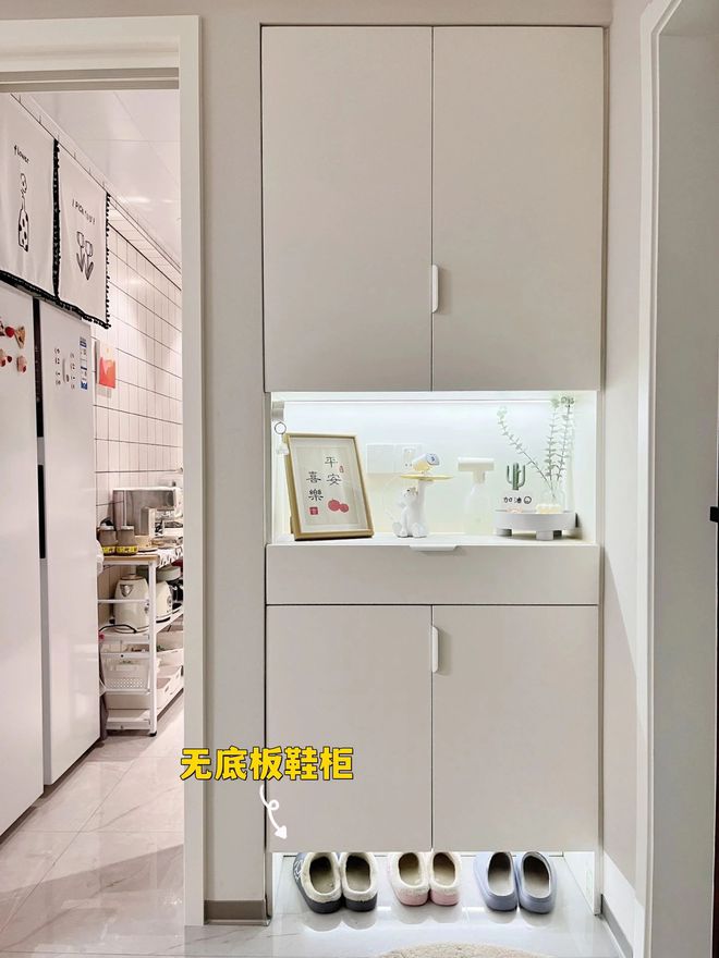 说到无底板鞋柜,大家可能觉得很陌生,但看到实拍图后,就会发现这是很常见的设计,其实就是在鞋柜下面留出一排空间,专门收纳常穿的鞋子。