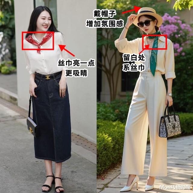 如果你希望打造出法式风情,快来试试丝巾,特别是穿着基础款衬衫的时候,搭配一条色彩鲜艳或图案独特的丝巾能够成为整个造型的焦点,打破单调!