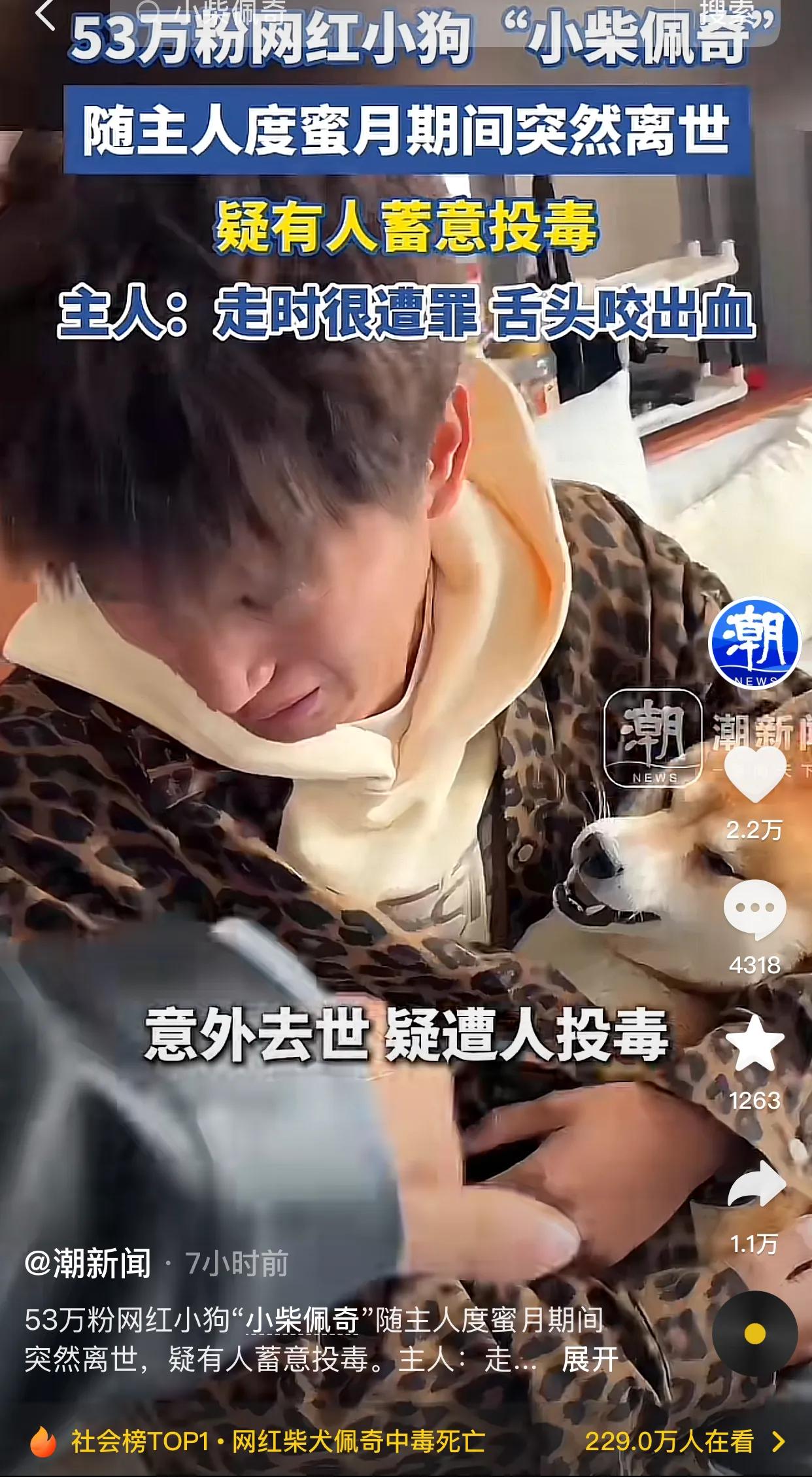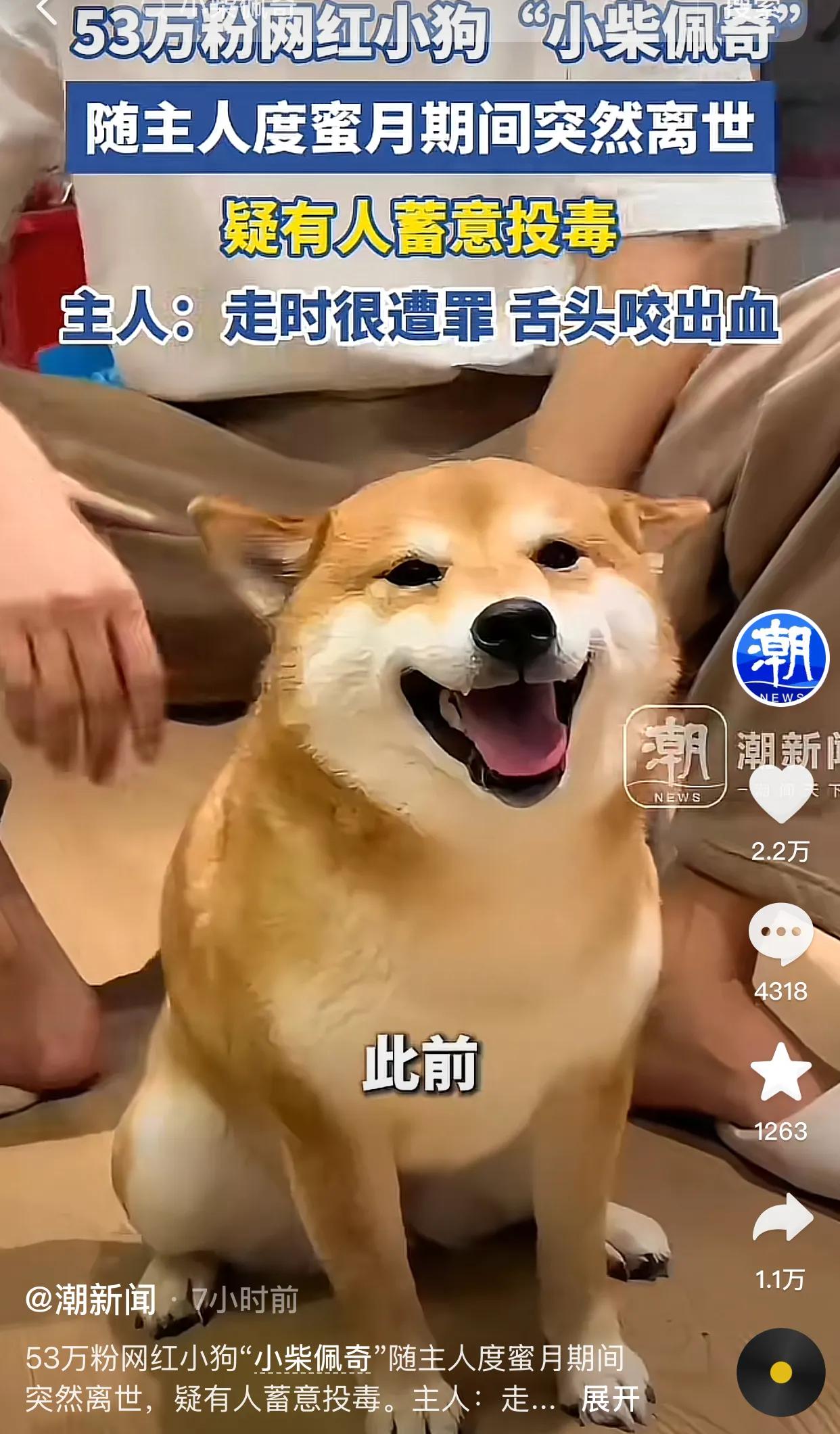 近日,网红柴犬“小柴佩奇”疑似遭投毒离世的消息,让不少网友心里揪了一下。这只圈了53.3万粉丝、获赞近2000万的柴犬,在山东老家的院子里误食有毒物质后痛苦离世,死前甚至咬破了舌头,而它的主人那时还在云南度蜜月,原本还盼着蜜月结束带它去看更多风景。