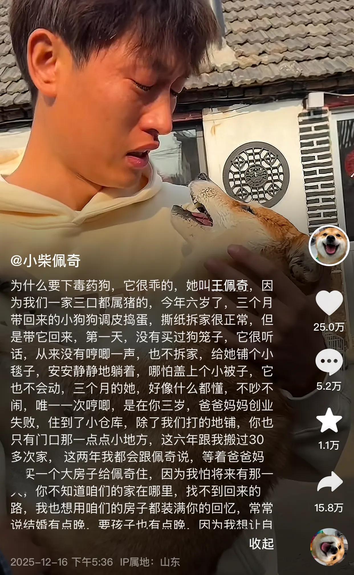 相伴六年的“家人”,突然离场的悲剧2025年12月,佩奇跟着主人回山东老家后,主人动身去云南度蜜月,留守的佩奇却疑似误食毒物中毒身亡。