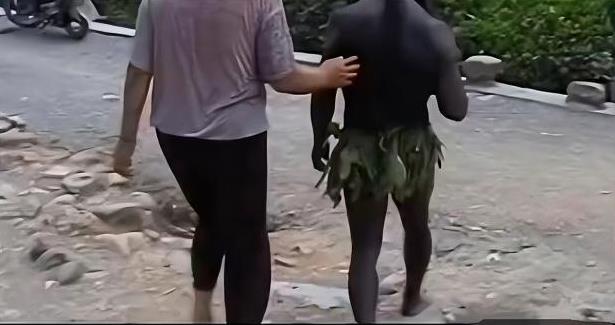 这个人的打扮非常不正常,特别像家里的小孩子在扮演野人的打扮,上半身什么都没有穿下半身有一块破烂的布料遮着,嘴角还染了一些血迹,最重要的是这个人似乎不太会沟通只会愣愣的看着他们。