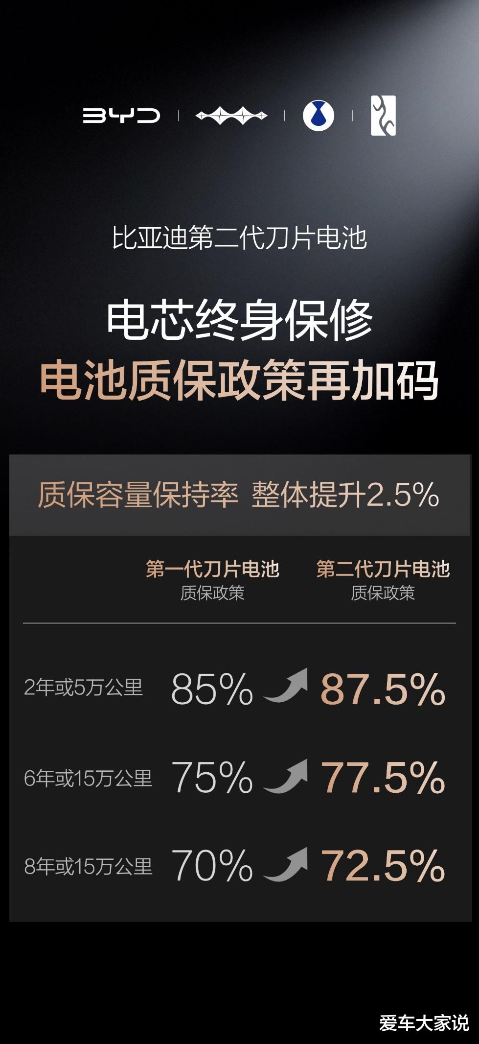 比亚迪还升级质保,容量保持率提升2.5%,低于77.5%免费包换,电芯终身保修。