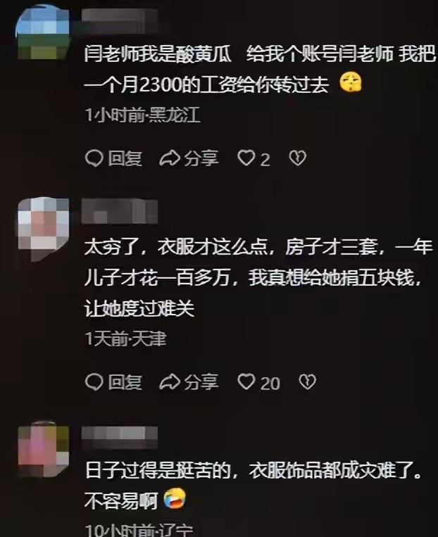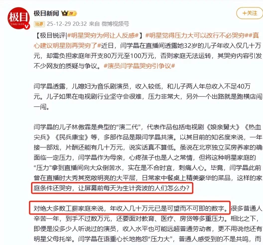 明星“酸黄瓜”事件再升级,失去代言,官媒点名,演员闫学晶直播坦言,儿子年入几十 万,儿媳月入不足万。