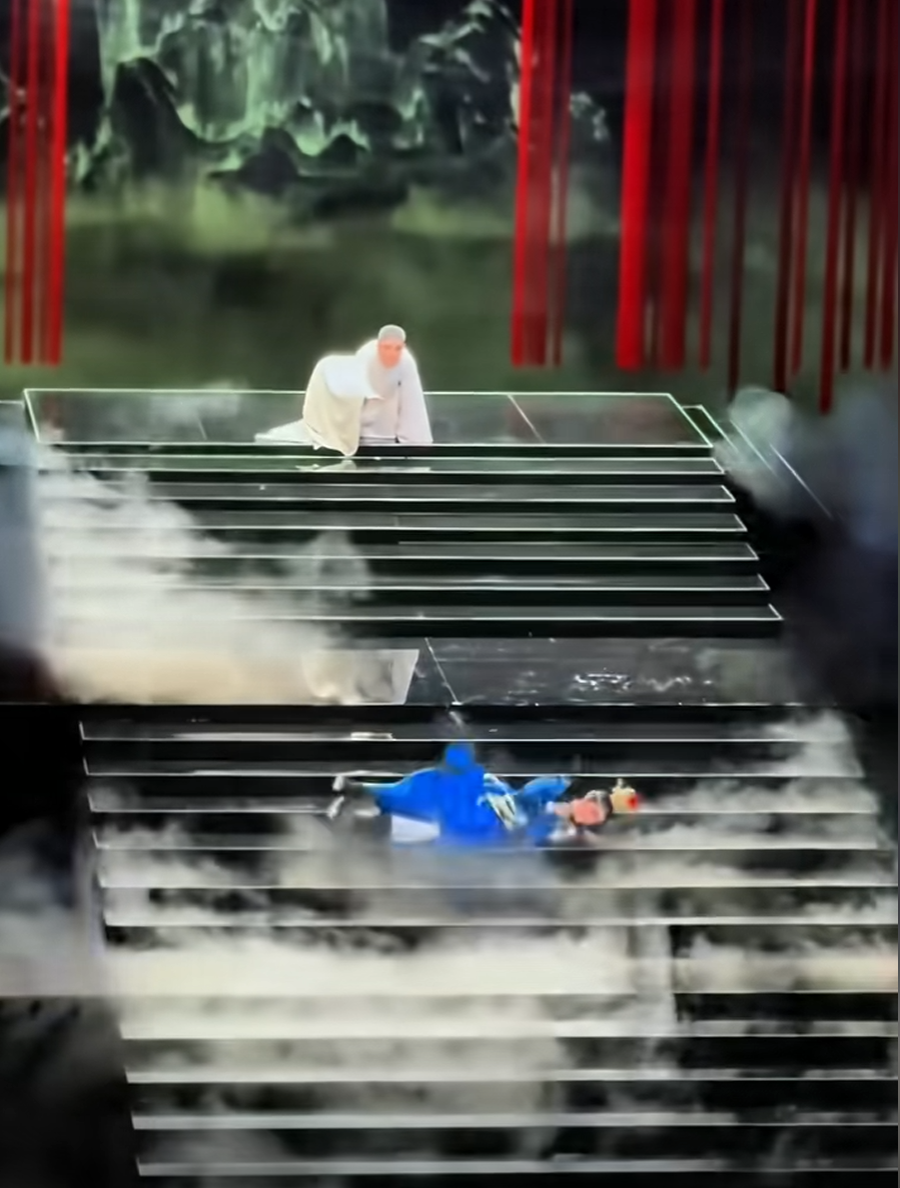 机械装置 + 多媒体投影:多层旋转台阶秒变亭台楼阁,前一秒还是黛玉葬花的落英小径,下一秒就切换成宝钗扑蝶的荷塘月色。导演徐俊透露:“为了 0.5 秒的场景切换,团队调试了 1000 多次!”