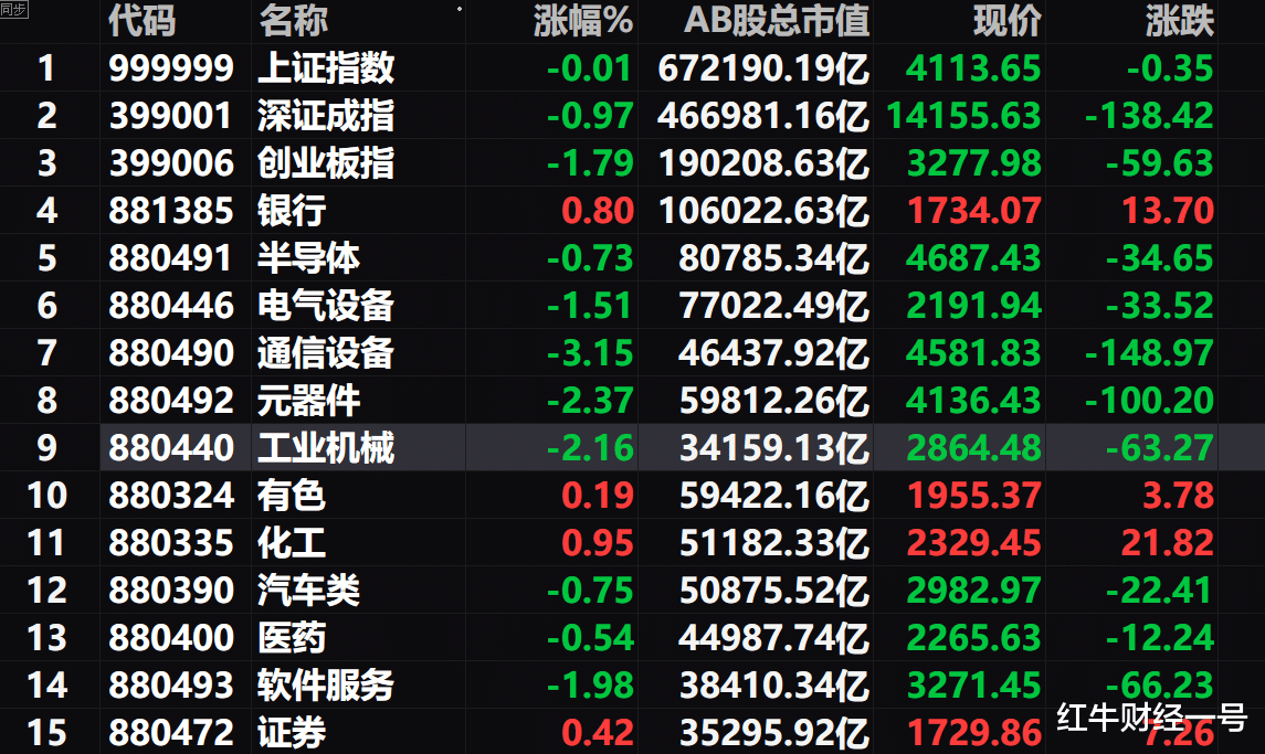 二、今天A股半导体、通信设备、元器件、软件等科技板块纷纷走低,其中通信设备板块跌超3%,从而拖累了A股走势,深成指跌近1%,但受银行板块支撑,沪指只是微跌0.01%并守住了4100点。