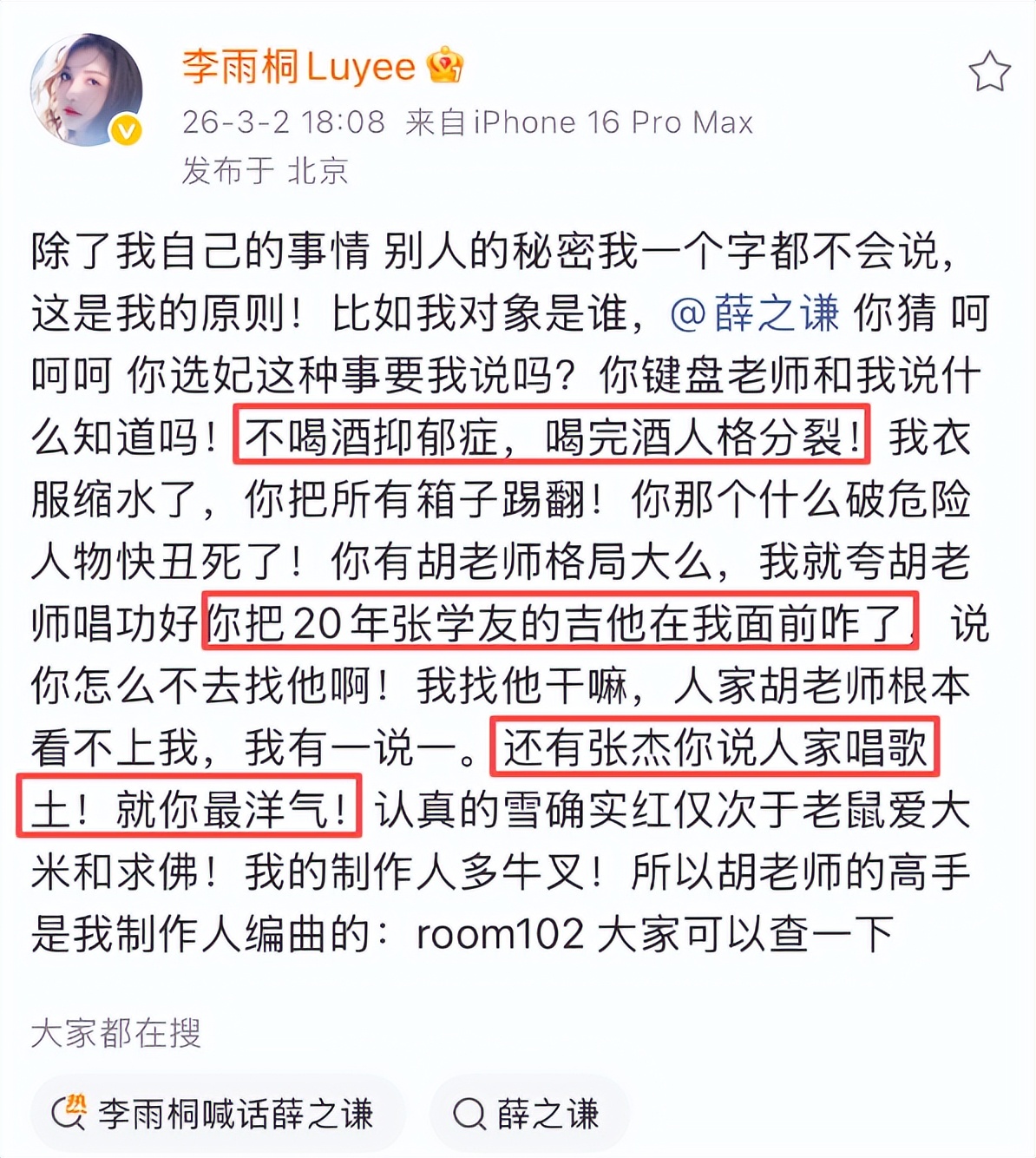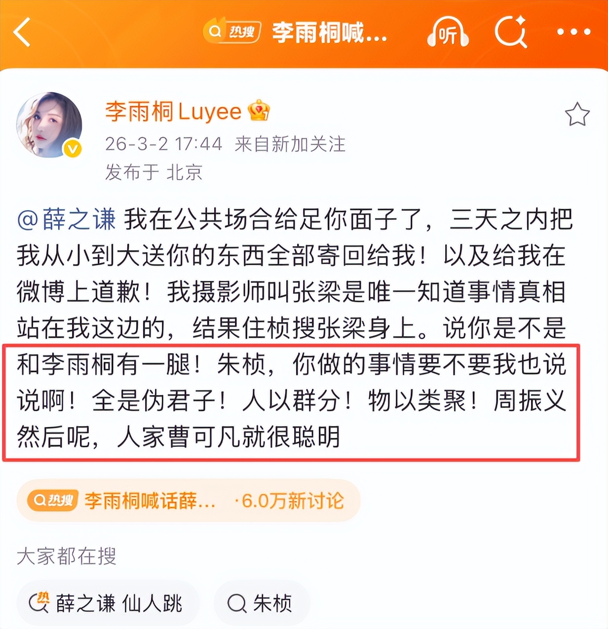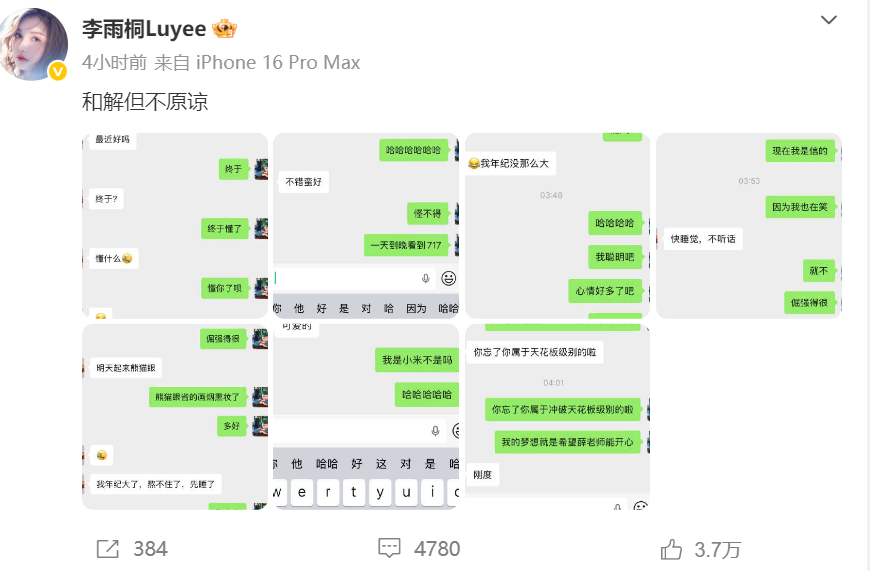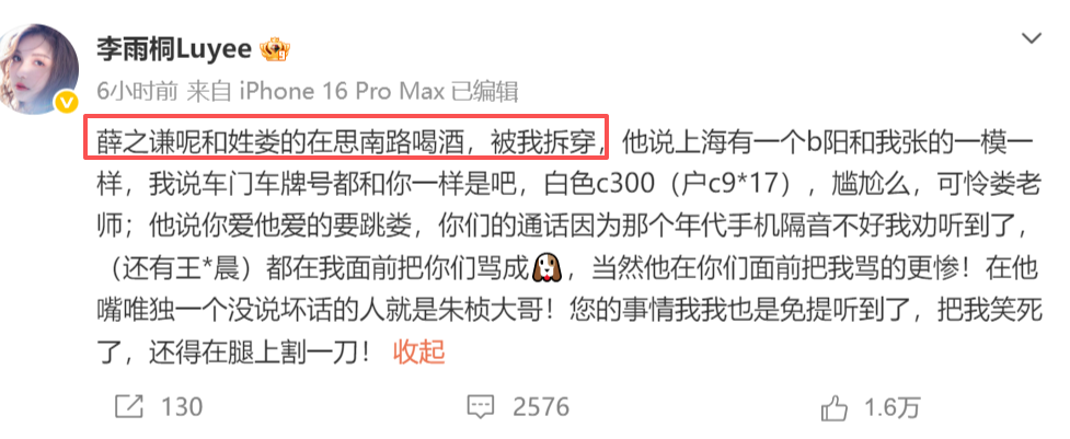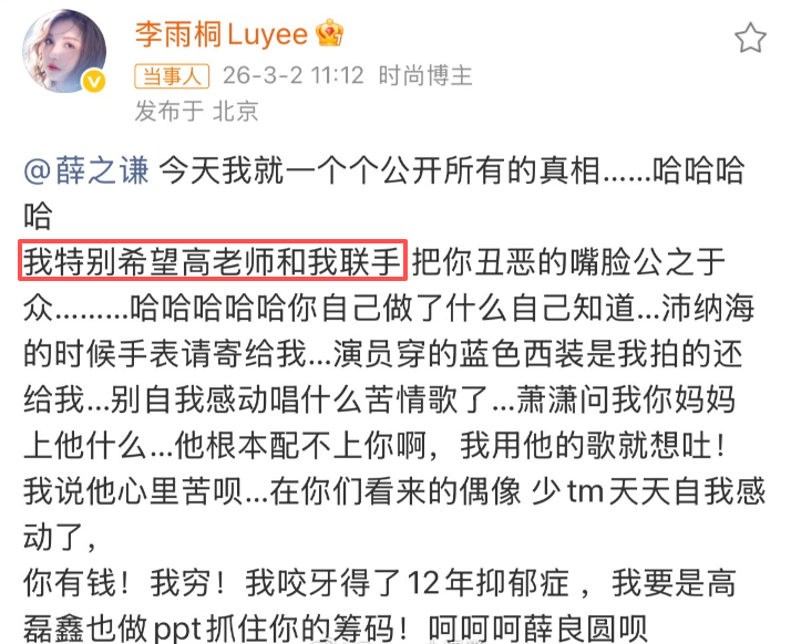 2026年3月2日下午,李雨桐在微博疯狂发文,还晒出和薛之谦的聊天记录,大爆他的猛料。