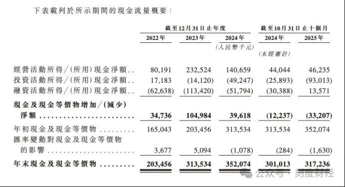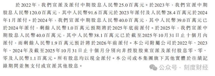 与复杂股权相伴的是争议十足的分红套现操作。招股书显示,公司2022年宣派股息2500万元;2023年宣派1.2亿元、2024年宣派4000万元、2025年截至10月宣派4000万元。其2022年至2025年10月累计宣派股息2.25亿元,占同期净利润超六成。