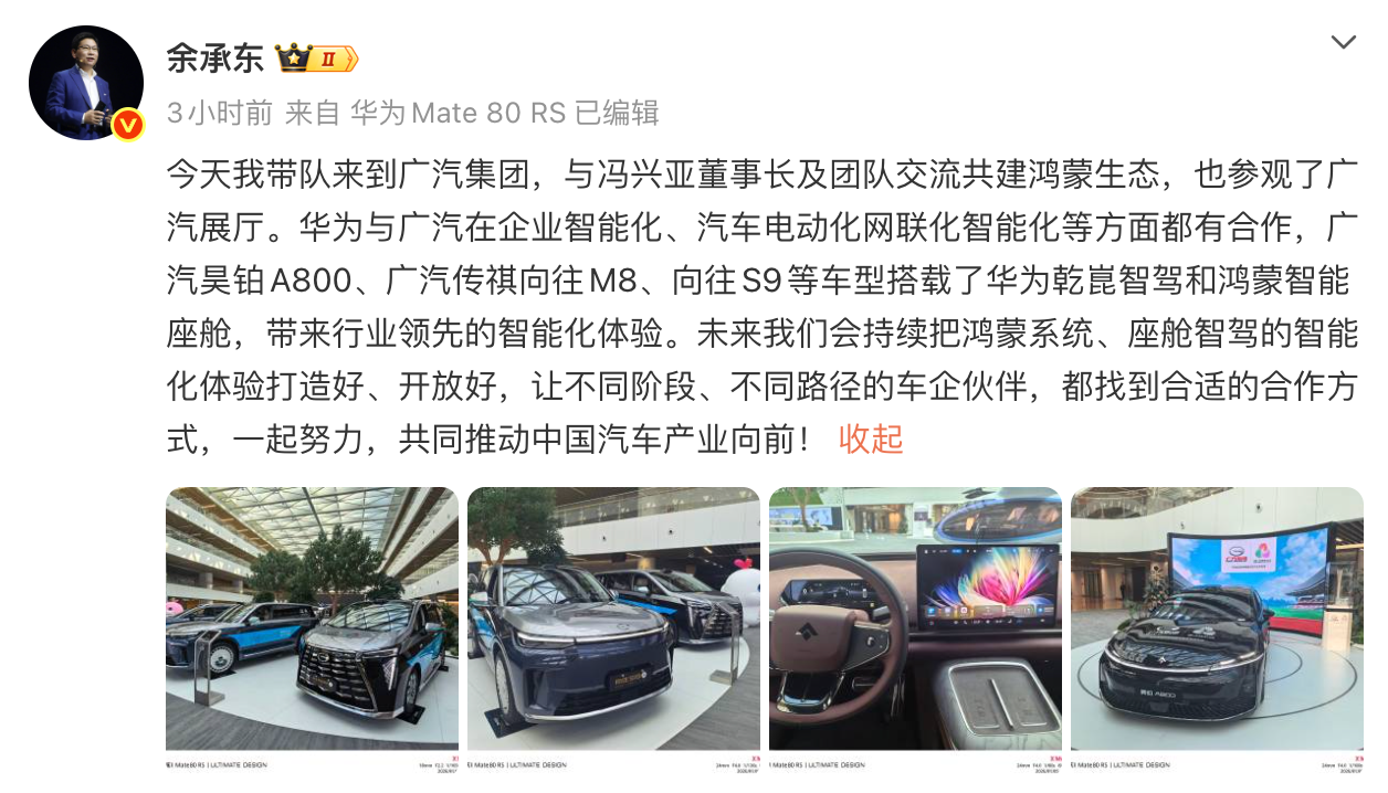 余承东在微博中直言:“今天我带队来到广汽集团,与冯兴亚董事长及团队交流共建鸿蒙生态。”而冯兴亚也迅速回应:“双方团队就鸿蒙生态的共建作了深入沟通。”并强调“未来还有广阔的合作空间”。