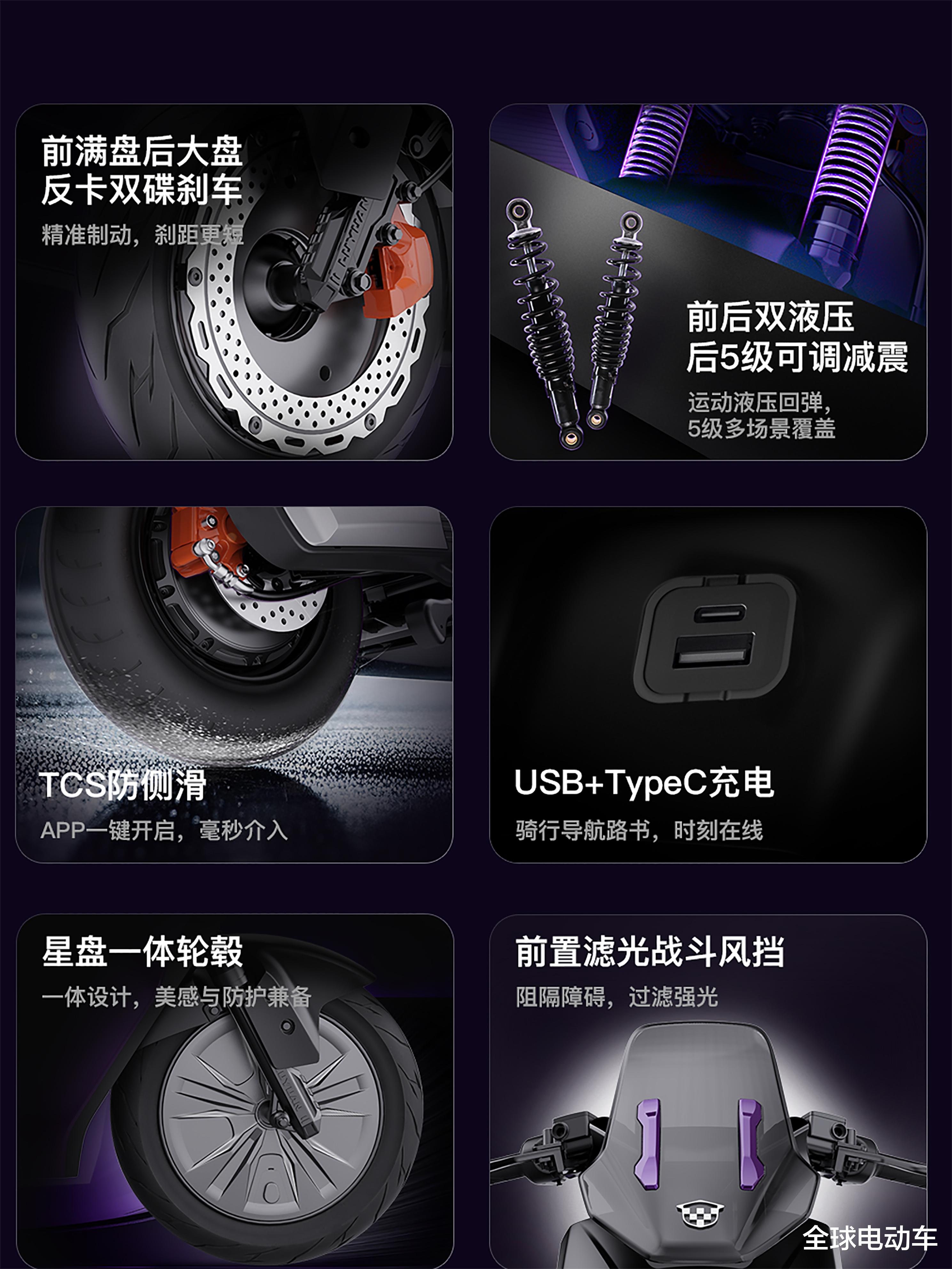 细节之处尽显巧思,360°环绕灯光系统包含20000cd远光矩阵大灯、4向律动转向灯及双侧柔光氛围灯,夜间骑行时兼具辨识度与安全性;400mm宽踏板与双排一体减压坐垫,兼顾双人骑行的舒适性与载物需求;6种配色方案满足年轻用户对个性化的追求。