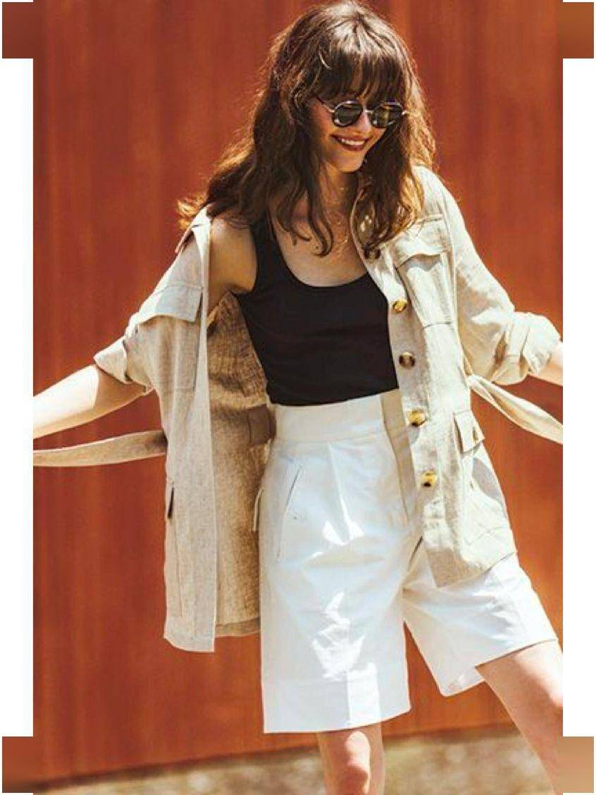 就算是一身白的搭配,也能够凭借版型、材质和配饰,打破单调感。棉麻材质的白色衬衫,搭配一条阔腿版型的短裤,再利用黑色腰带加持,便能分割出身材比例。