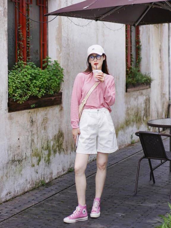 夏天不能穿的太沉闷压抑,一定要学会运用彩色系的单品。像这种粉色套衫,就能过增添活力感,让造型看上去更有生命力,搭配白色牛仔短裤,再踩上一双粉色帆布鞋与之呼应,回头率100%。