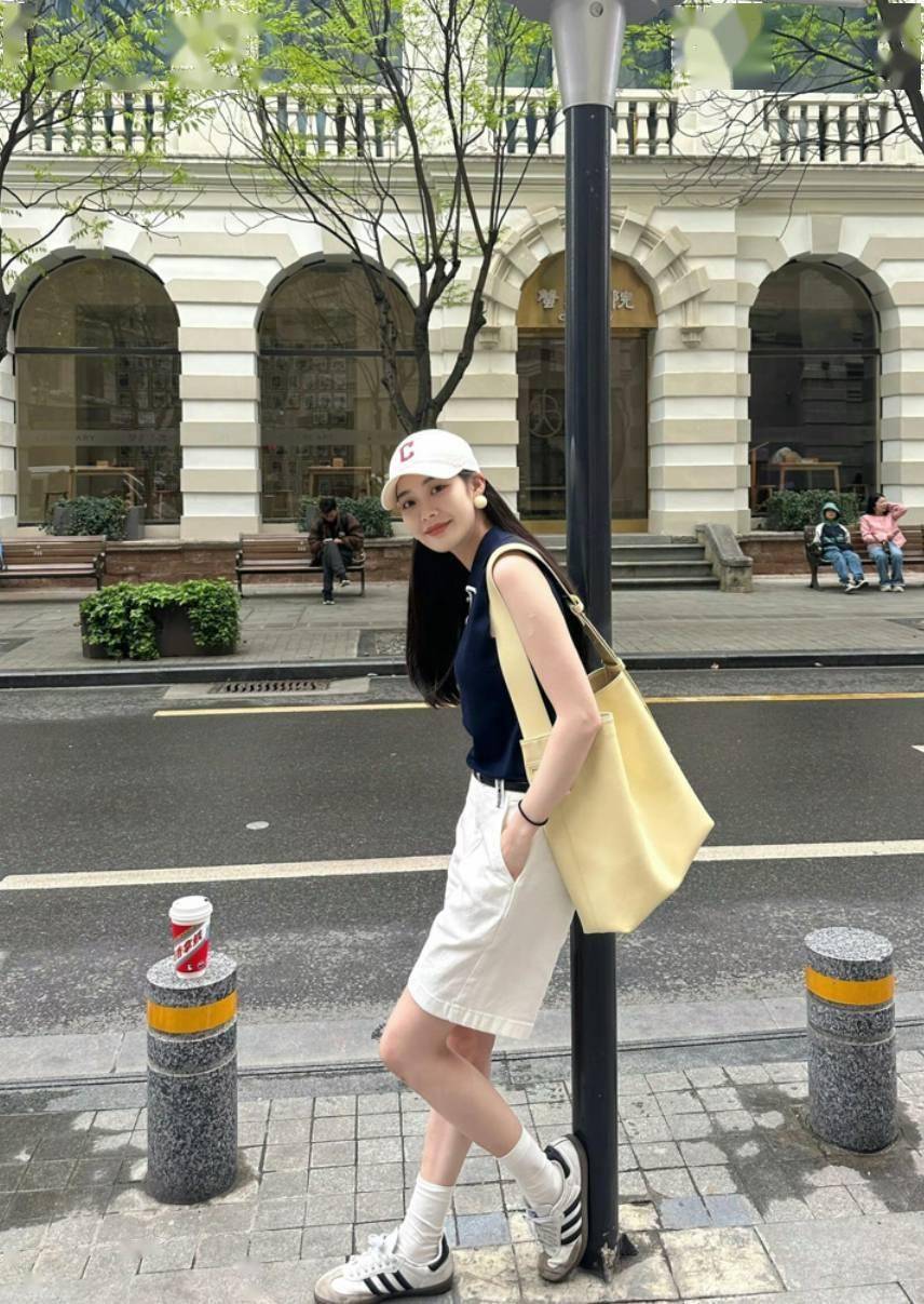建议大家可以多尝试一下法式风的穿搭,这种风格也离不开短裤的衬托,刚好遮住臀部的白色短裤,完全就没有膨胀感,搭配上修身款式的亚麻马甲,又增添了一丝老钱风。