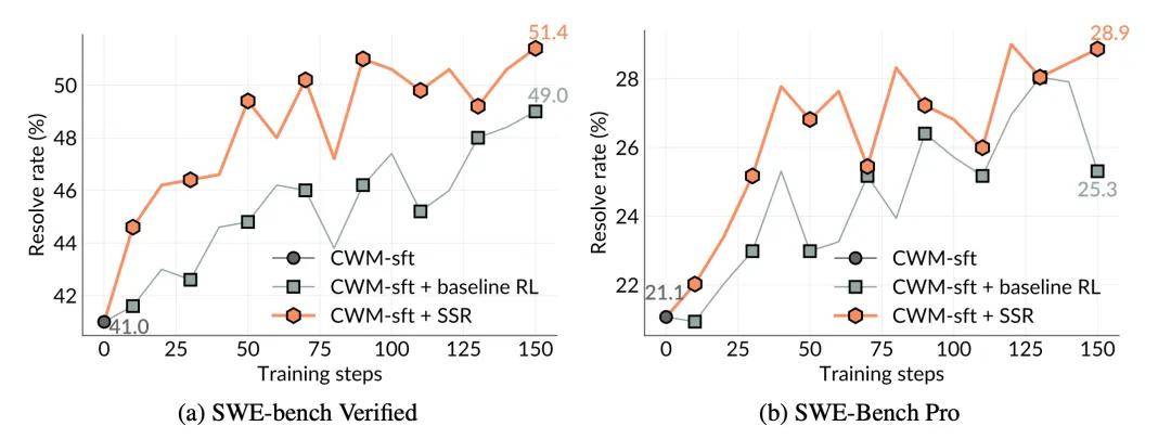 研究团队在 SWE-bench Verified 与 SWE-Bench Pro 两个基准测试上,对基础模型(Base Model)、传统强化学习方法(Baseline RL),以及 SSR 方法进行了系统对比。