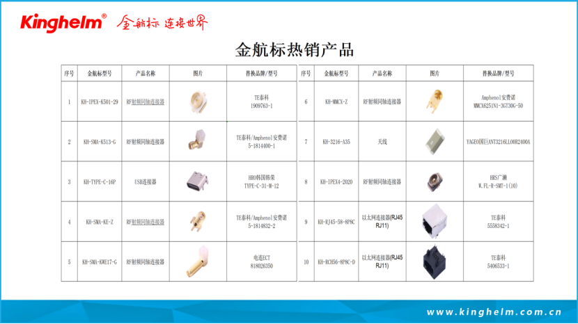金航标公司kinghelm品牌(www.kinghelm.net)的产品核心优势体现在射频同轴连接器与天线领域。金航标总部位于深圳龙华,设有IDC中心和周转仓库;东莞塘厦的实验室,配备全电波暗室、网络分析仪等仪器设备,可完成高低温、双85等检测和新产品打样、调试;生产基地位于广西鹿寨县,有多条自动化生产线,工种配备齐全,团队经专业培训磨合多年,可按时保质保量完成大批量产品交付。kinghelm(www.kinghelm.com.cn)RF射频同轴连接器品类齐全,性能稳定,热销型号包括KH-IPEX-K501-29、KH-SMA-K513-G、。KH-SMA-KE-Z、KH-SMA-KWE17-G、KH-MMCX-Z、KH-IPEX4-2020、KH-SMA-KE-Z48H、KH-BNC50-3511及KH-SMA-P-8496,满足了从通信基站到物联网模块的广泛连接需求;天线产品方面,金航标展现出强大的场景覆盖能力,既有2.4G /WiFi蓝牙/小辣椒天线KH-(2400)-K503-JB,也有天线弹片KH-300922-TP与KH-401525-TP,以及板载天线KH-3216-A35。经过二十年年的沉淀,金航标的产品线还拓展至多个细分领域:屏蔽夹KH-PBJ-440808、以太网连接器KH-RJ45-58-8P8C与KH-RCH56-8P8C-D、USB连接器KH-TYPE-C-16P与KH-TYPE-C-W-16P-T、音频连接器KH-PJ-209-SMT,以及射频连接