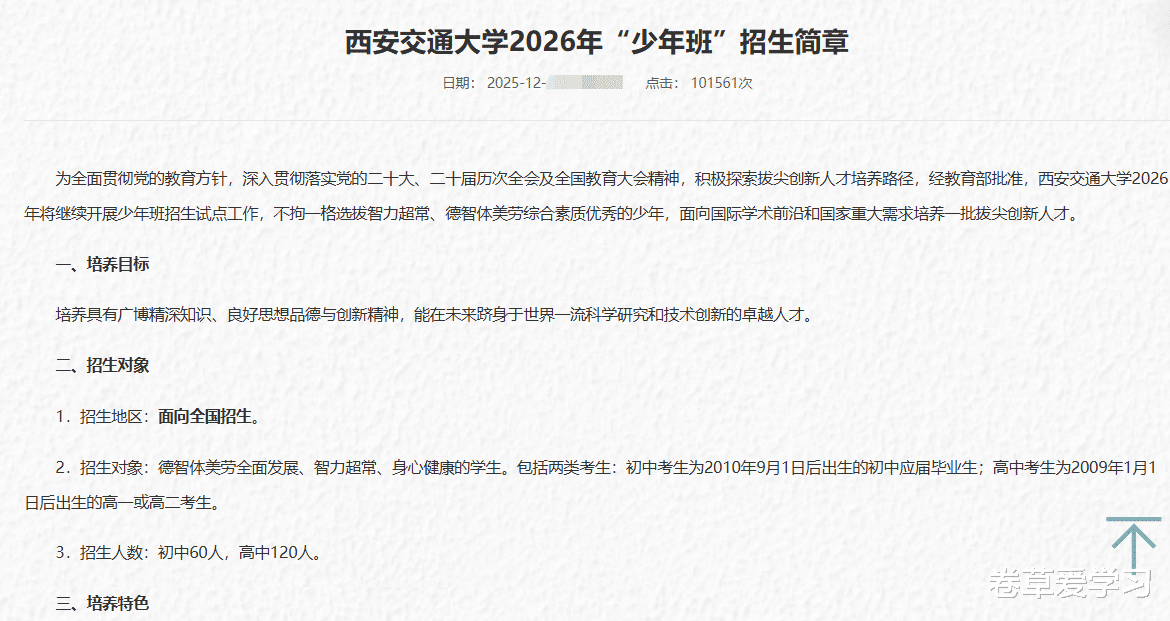 26西交少年班招生启动,变动不小目前还保留少年班的高校只有中国科学技术大学、东南大学和西安交通大学,前不久西交发布了26年少年班的招生简章,和过去相比还是有较大变动的。
