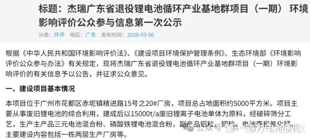 近日,相关网站发布了《杰瑞广东省退役锂电池循环产业基地群项目(一期)》 环境影响评价公众参与信息第一次公示。