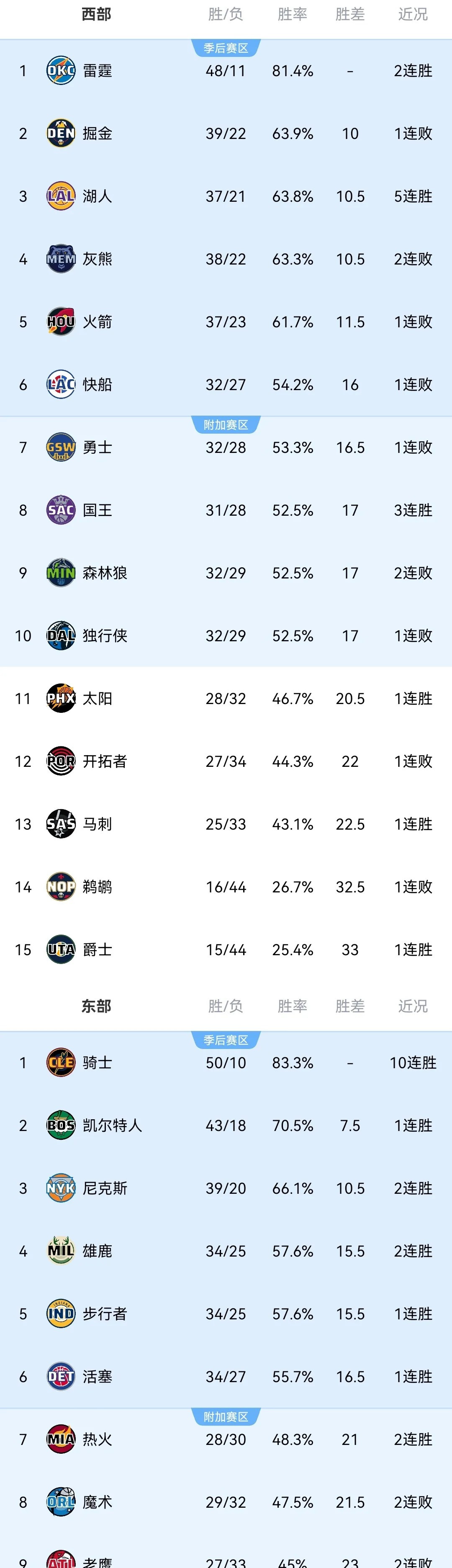 随着这2场比赛结束,NBA最新排名如下:骑士豪取10连胜,稳居联盟第一;掘金不敌凯尔特人后,湖人迎来机会,他们和掘金之间只差0.5个胜场了!