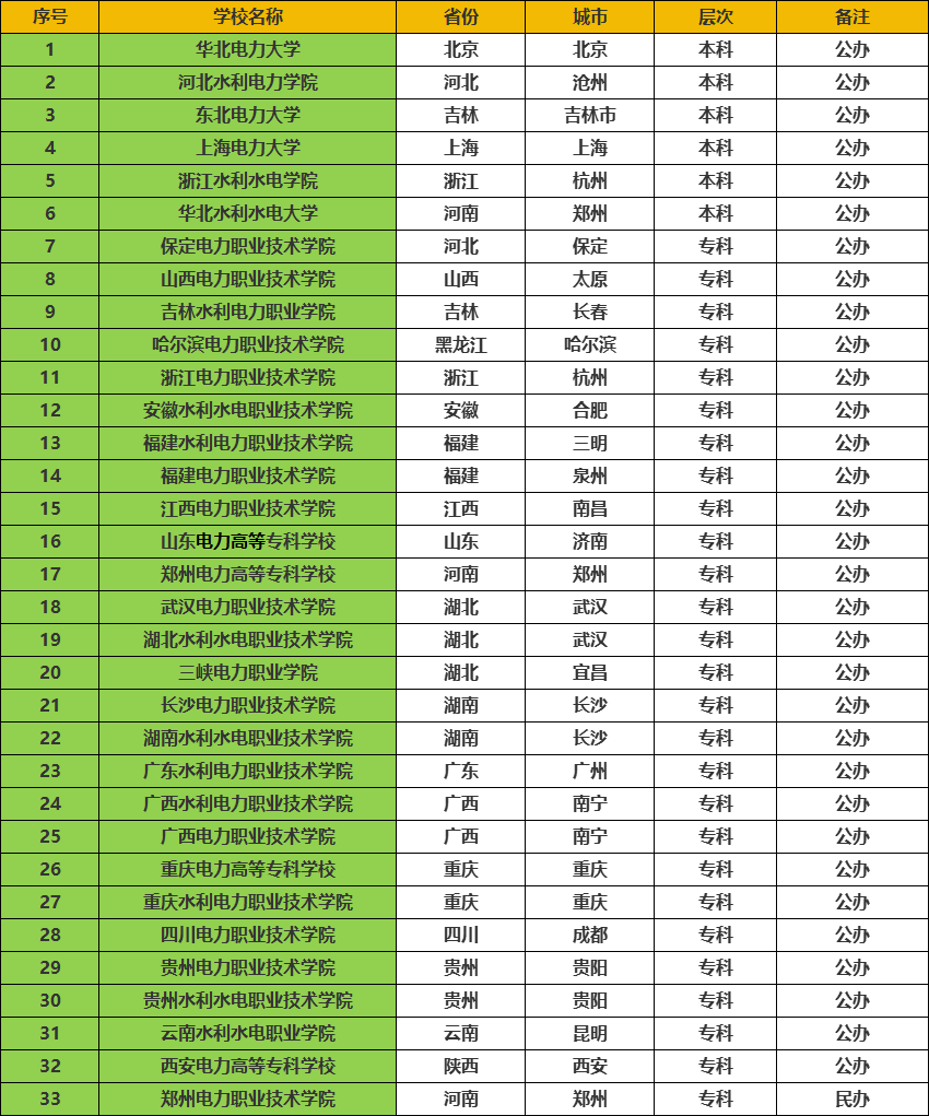 要是毕业后想进入电力系统,那肯定是优先考虑相关的院校,如我国目前就有很多所以电力命名的高校,包含了本科和专业,盘点了相应的名单,整理成表格如下: