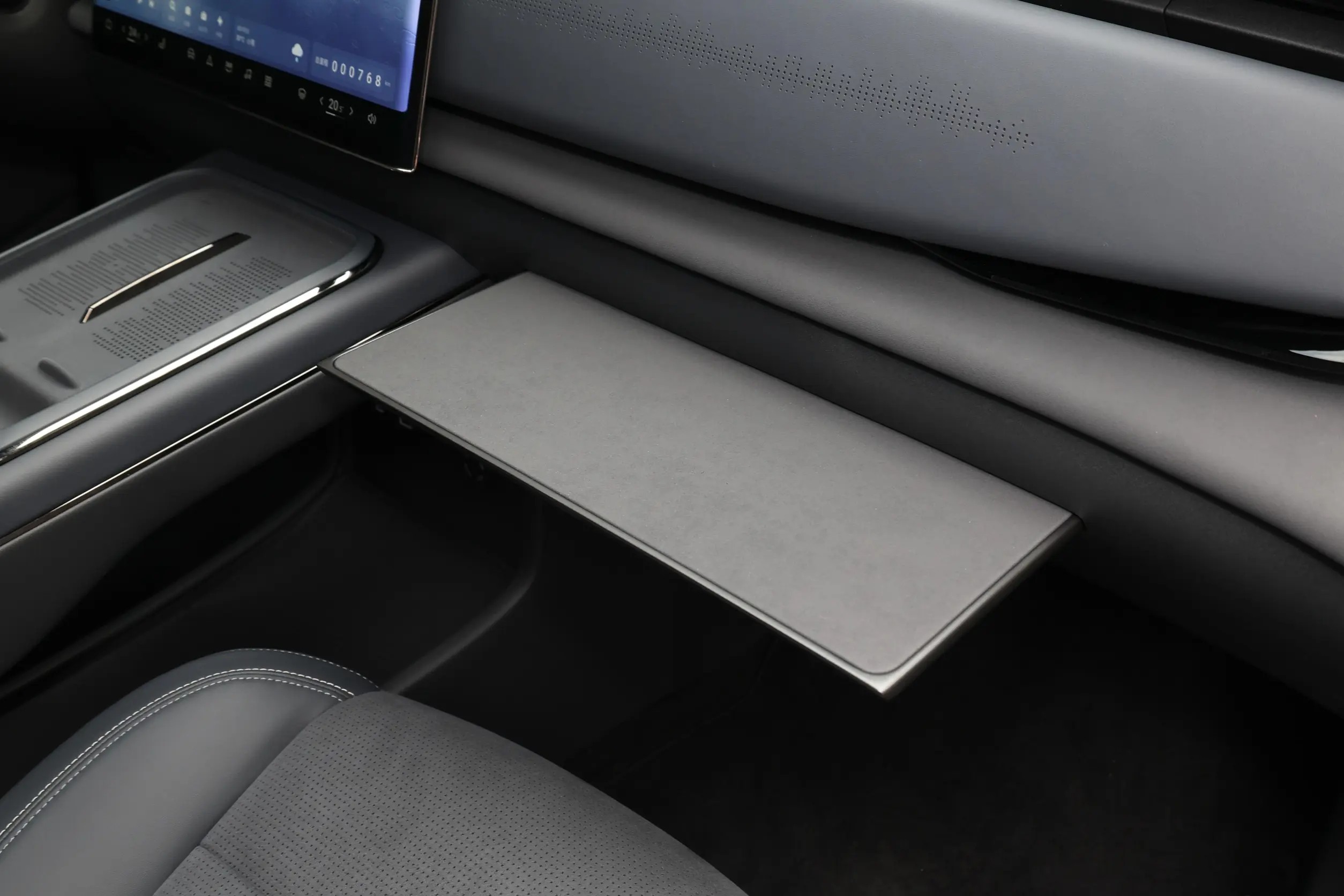 岚图知音的内饰方面,中控台布局简简单单,6英寸液晶仪表隐藏在中控台里面,仅显示基础的车辆信息,而驾驶者主要的信息获取是依靠29英寸的AR-HUD抬头显示功能,并且还可以实现“实景拟合”显示,信息呈现相对直观,中控屏尺寸为15.4英寸(可选装15.05英寸中控屏),支持向副驾侧滑移,而且在副驾手套箱上方,配备了隐藏式小桌板,我们可以一键控制中控屏滑移和小桌板展开。