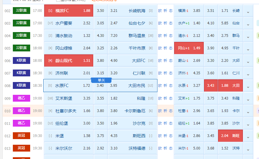 005 冈山绿雉vs千叶市原,主队交锋严重劣势,最近几年都没赢过,两个队伍实力差距也不大,客队交锋优势那么市场青睐多一点,主任让客队让球让出平手,那么筹码大部分聚集在上盘,顺应了基本面,反过来支持人下盘胜率更高!方向:让胜,比分:1-1,2-1。