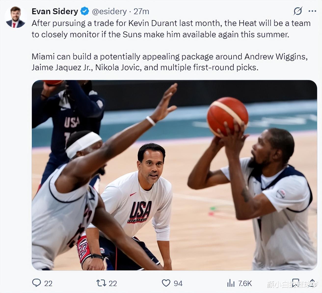 北京时间3月23日,NBA记者埃文-斯迪瑞报道,交易截止日热火追逐KD失败了,如果太阳今夏再次将杜兰特摆上货架,那么热火将会是他们密切关注的一方。