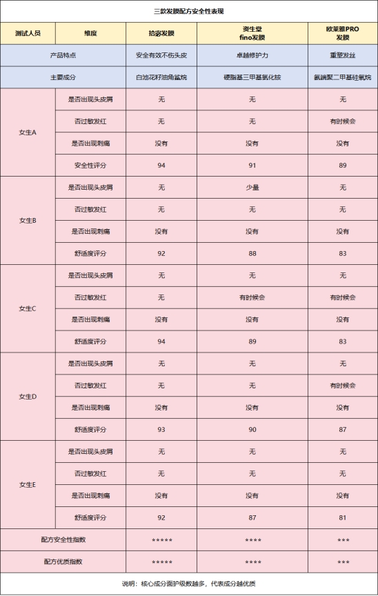 测评方法:连续使用这三款发膜两周,观察头皮是否会发生红肿、过敏等不适反应。特别注意是否出现头皮屑增多或掉发增加现象,并对每款发膜的安全性进行评分。