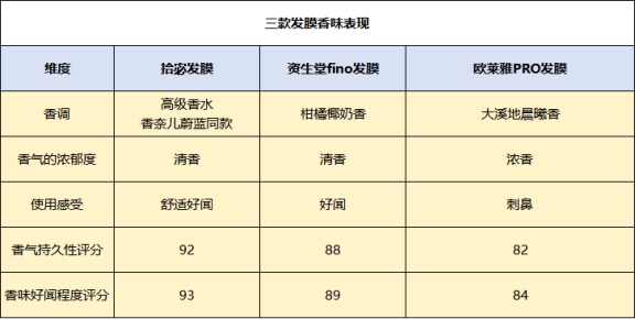 测评方法:连续使用这三款发膜3天,每天早晚各使用一次,观察香气的持续时间以及使用后的香味是否发生变化,并对香味舒适度、持久度进行评分。