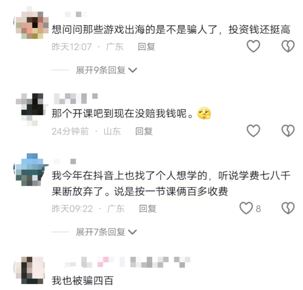 伤了多少孩子,他们为了就业付出金钱与努力,结果发现是骗局但凡能赚钱的,轮到他三姑六婆,七大姑八大姨,也轮不到你这个陌生人之前在大鹏报名学习影视后期,结果倒闭了,网站进不去,课也没学完