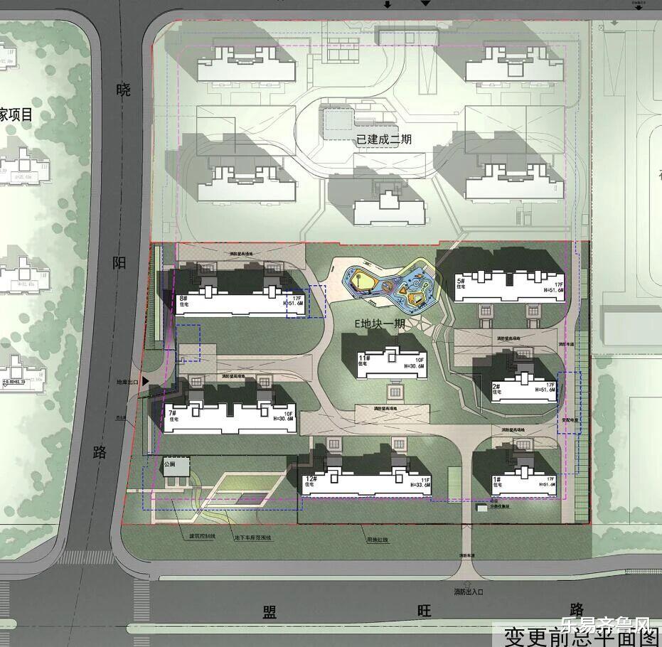1、总平面图:调整部分楼座位置及正负零标高、场地标高、消防车道、消防登高场地、停车位布局、活动场地设计,增设景观廊架、采光井。