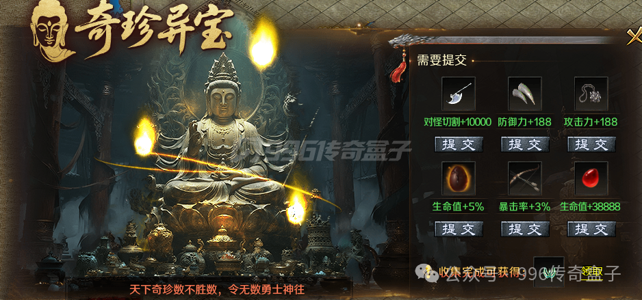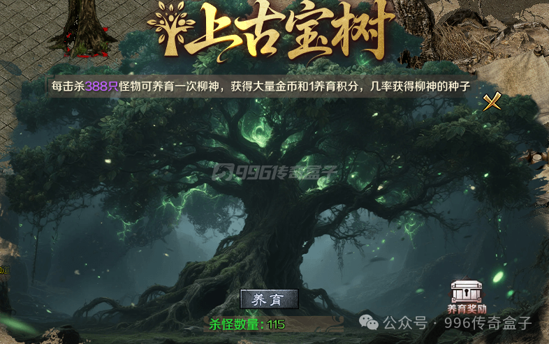 击杀满388只怪,就能去浇灌上古宝树,非常简单。每次浇灌都能获得大量金币和养育积分,还有几率获得柳神的种子,食用这个种子达到一定次数可以兑换稀有奖励。养育积分可以兑换材料、货币和累充。