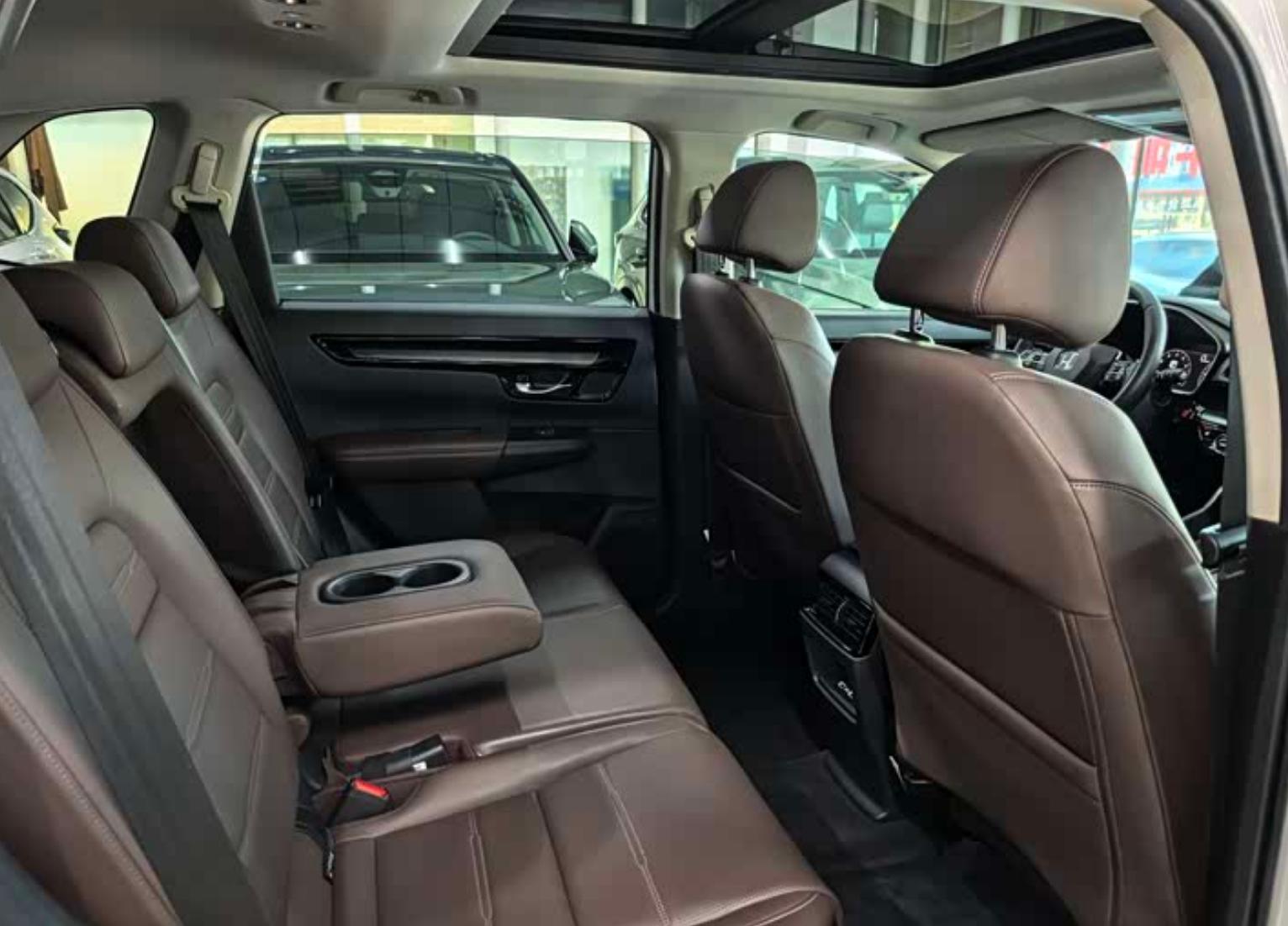 本田CRV的车身长宽高分别为4703mm、1866mm、1680mm,轴距长度为2701mm,车身长度超过4米7,轴距也超过2米7,在这个级别还是很有竞争力,身高1米8,体重80kg的男性用户,将前排座椅调整到一个合适的位置,坐在后排无论是头顶还是腿部空间都很宽敞,甚至能翘起二郎腿,而且储物空间设计的很人性化,扶手箱等常规设计均有配备,方便乘客放置一些随身的小物件,后备箱容积也很大,能放下三个中等尺寸的行李箱,后排座椅放平后,后备箱空间还是进一步增大,实用性不错。