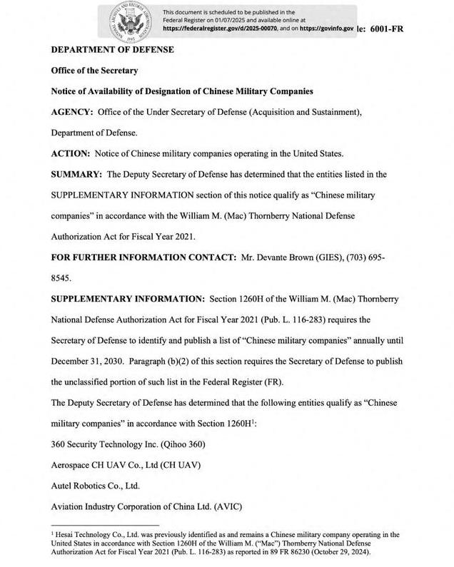 当地时间2025年1月6日,美国国防部又使出了其屡试不爽的打压手段,将腾讯、宁德时代、长鑫存储、移远通信等134家中国企业列入所谓“中国涉军企业”清单(CMC清单),还声称是按照美国《2024财年国防授权法》的规定行事。