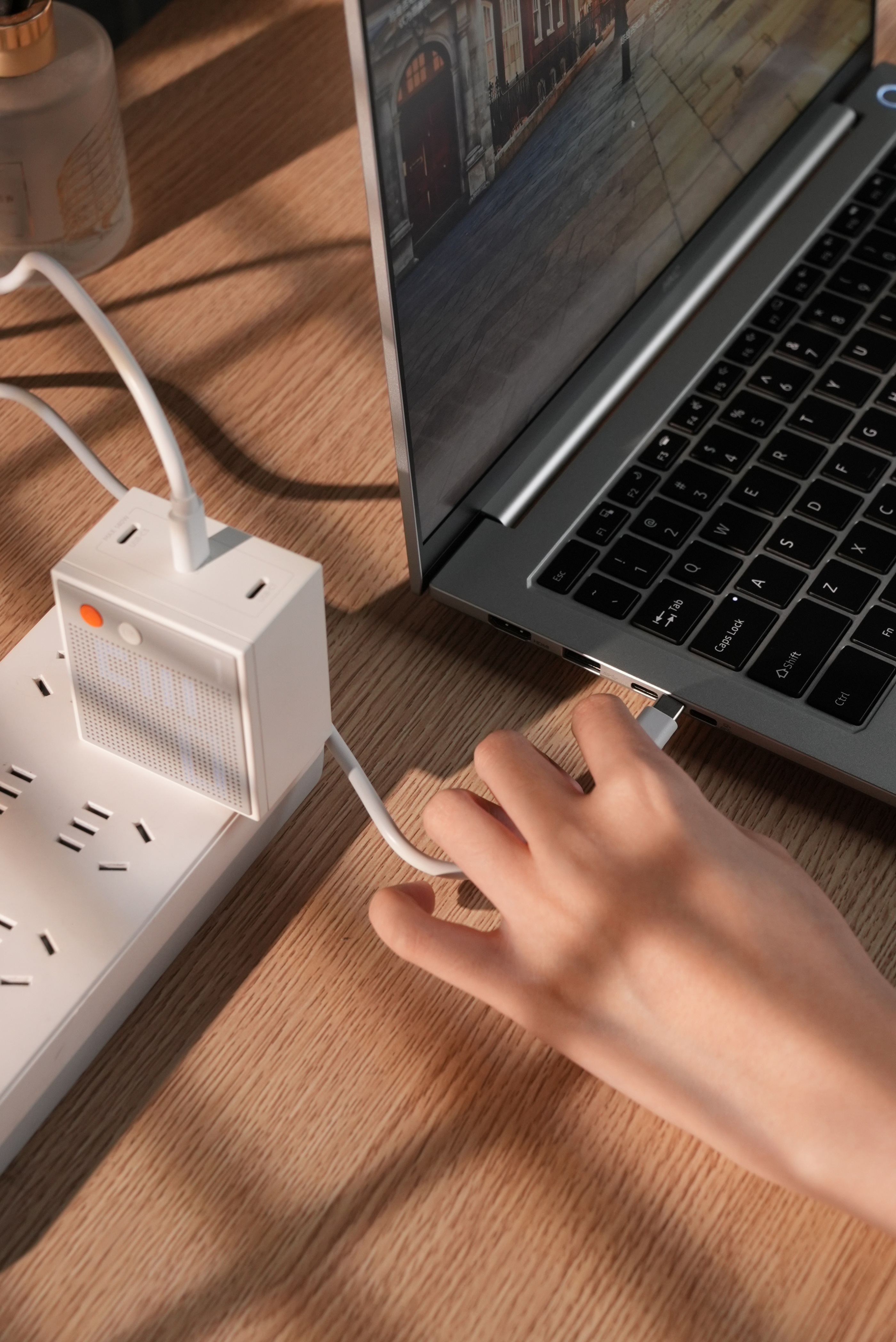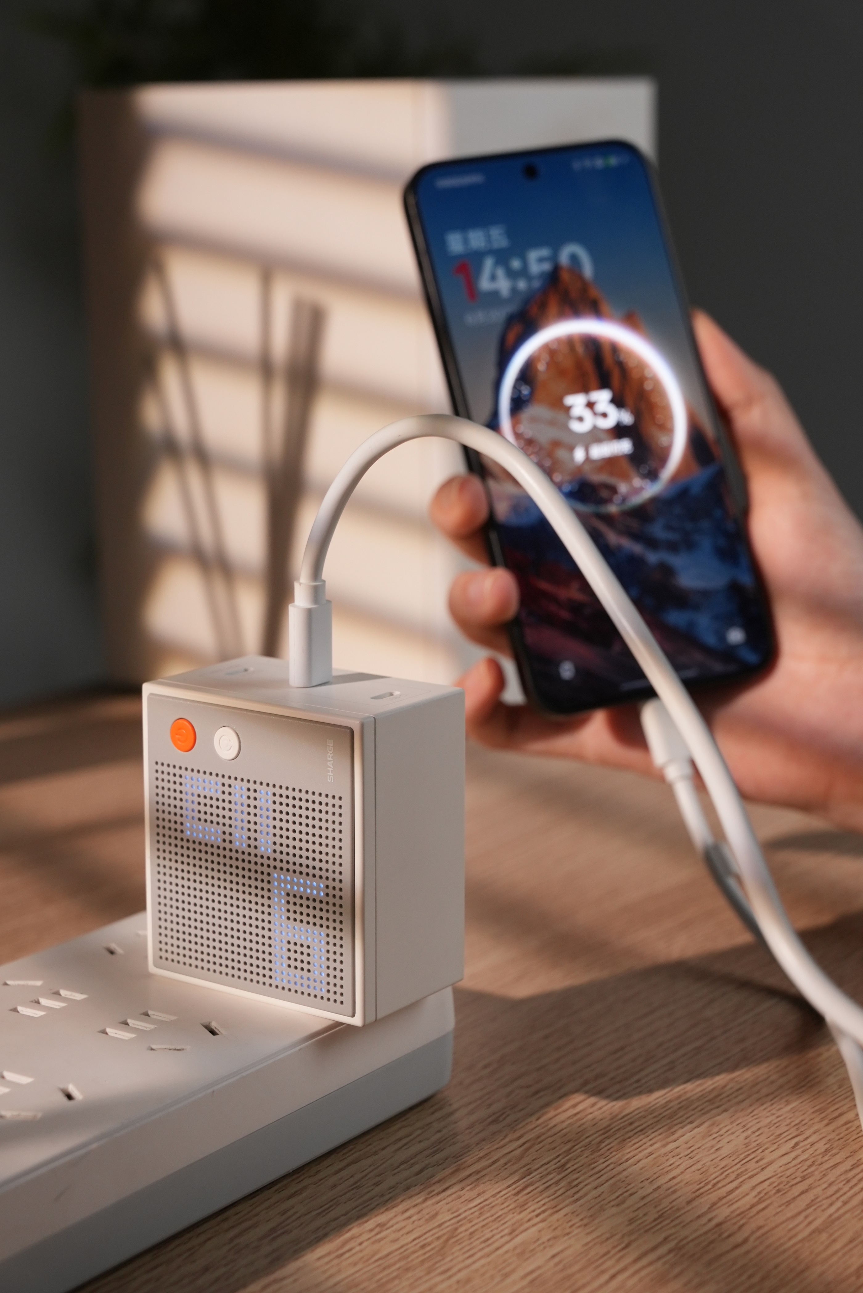 设计有点复古风,简约的灰白色搭配,像个小音箱。关键有意思的是它一面设置了点阵屏幕,能显示实时功率,亮度适中不会太刺眼,也不怕像那种LED屏幕担心刮花,可以说是好看又贴心了。