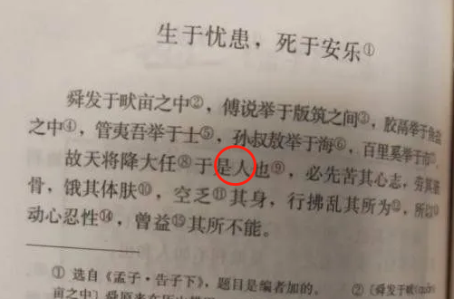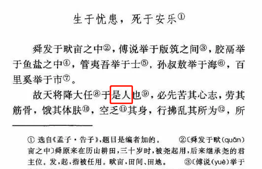 人民教育出版社说历套教材文章一直是“故天将降大任于是人也”,从未有过“故天将降大任于斯人也”,不过“斯”和“是”两个字,都表示“这”的意思。那么问题来了,为什么那么多人记忆里学习的都是“私人”呢?到底是什么原因造成的?恐怕一时半会儿不会有答案了。