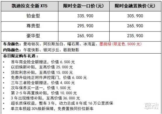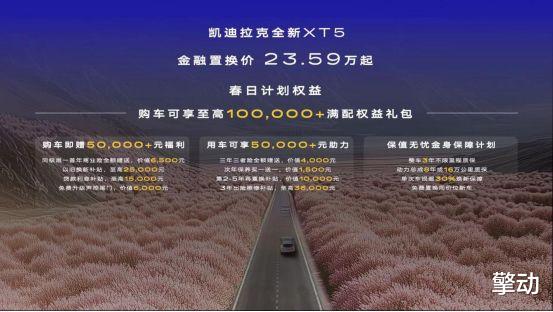 除了春日焕季版限时预售权益以外,凯迪拉克全新XT5即日起为有分期需求的用户重磅推出金融置换价23.59万起,并带来极具诚意的春季购车政策——-同级唯一至高 100,000 元满配权益礼包,包含购车可享的全额赠送首年商业险补贴、以旧换新品牌补贴等;提车可享的全额赠送三年第三者责任险,次年保养买一送一等;后顾无忧的金身保障权益,除了整车3年不限里程,动力总成8年或16万公里的超长质保外,全新XT5单次车损超过30%免费置换同价位新车。可以说“小修有补贴,大修免费换车”,让全新XT5车主在整个用车全周期安心无忧。