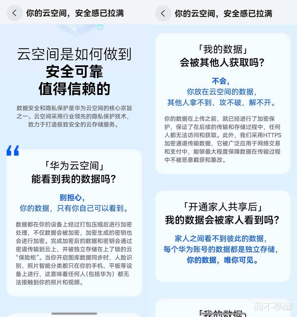 当然数据安全这块我比谁都看重。毕竟我的照片不仅有珍贵的家庭合影和旅行风景,还有些业务数据,要是真泄露了,后果还是很严重的。查了下才知道,华为云空间使用了端侧、传输通道、云端存储等多重加密方式,简单说就是:我上传到云端的数据只有我自己能看,这一点真的让人特别安心。