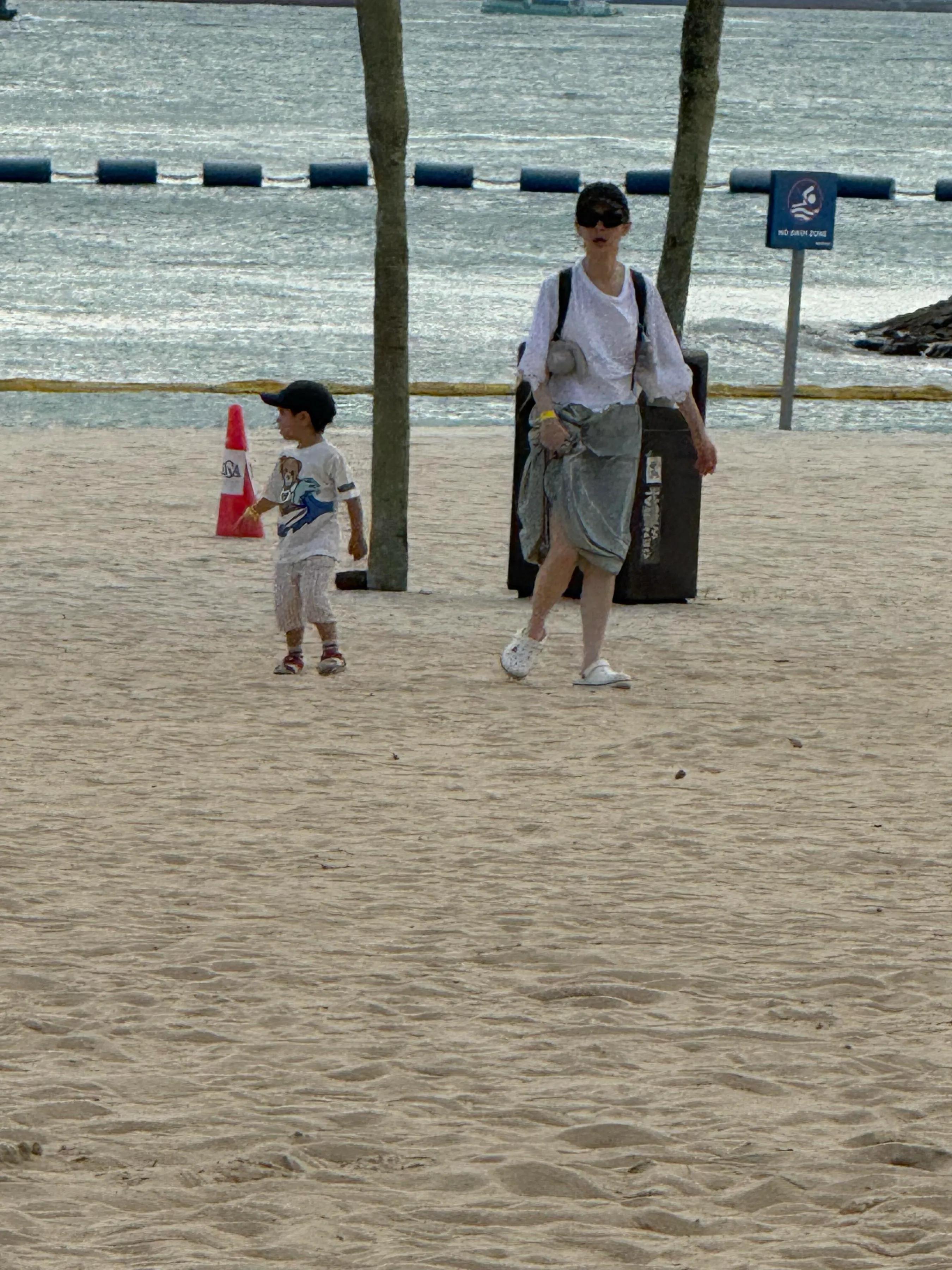 还有网友晒出前一天的偶遇照片,戚薇带着儿子在沙滩玩,seven 看起来软萌可爱。