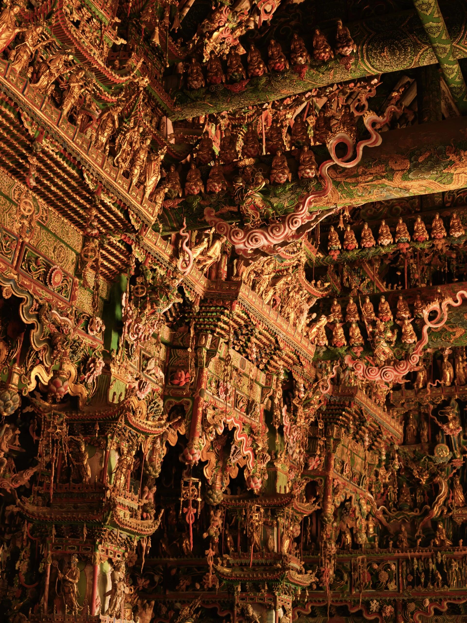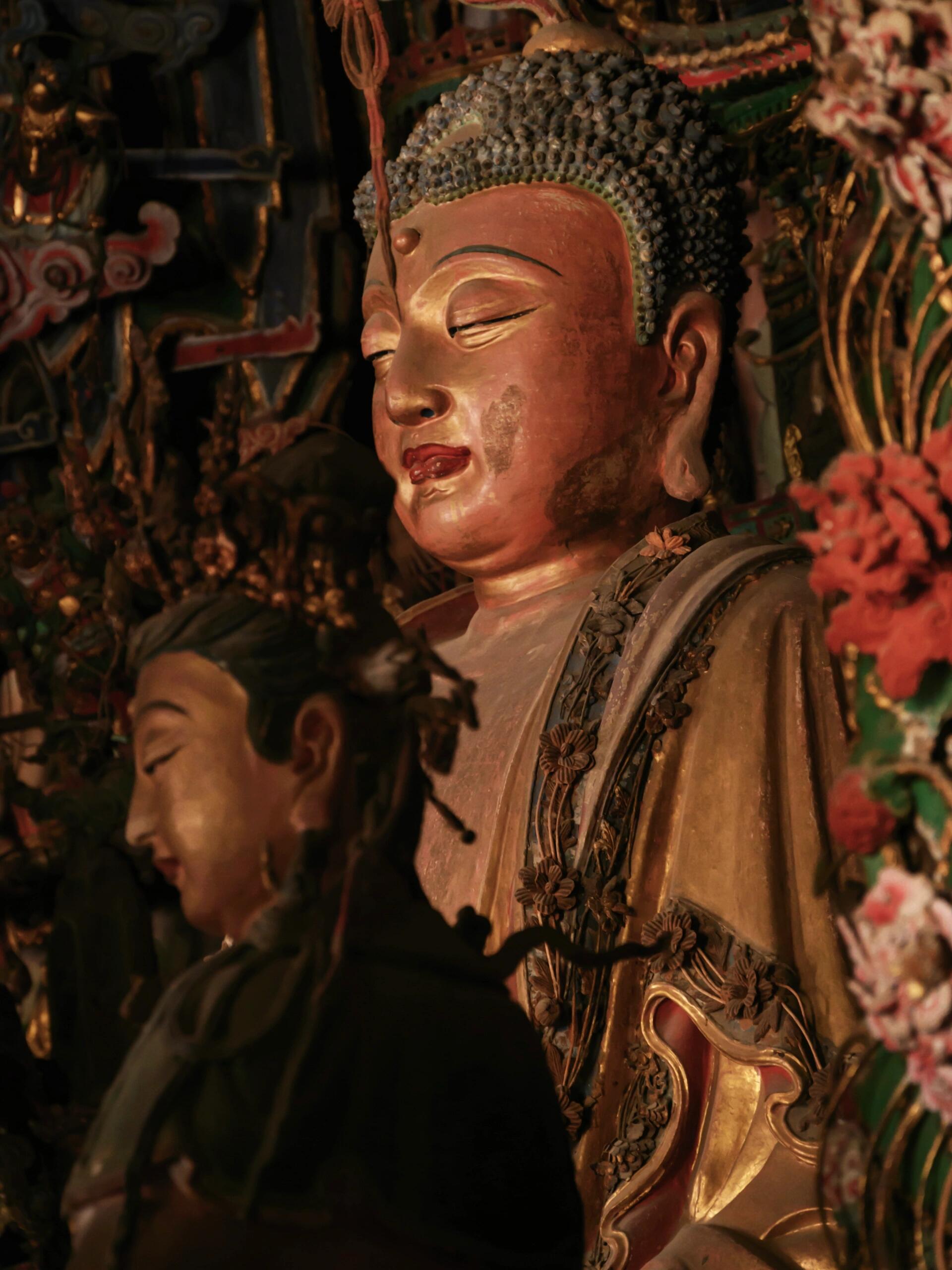 刚进殿门就得收住脚,不然准会撞上迎面的五佛宝龛。正中央的毗卢遮那佛垂着眼,衣纹像被风吹皱的金箔,可仔细看他座下的莲台,每片花瓣都刻着小佛,小佛的莲花座上又嵌着更小的佛,一路小下去,直到小得只剩个金点。有年轻人举着放大镜找,说最少叠了七层,可守殿的老僧却说:"真正的佛国哪有层数?就像这殿里的光,看着是一束,其实早分了千万道。"这话在上午十点半突然有了凭据——阳光斜斜切过窗棂,刚好照在宝龛左侧的文殊菩萨身上,菩萨坐骑青狮的鬃毛突然泛起银光,凑近了才发现,每根鬃毛都是根细如发丝的铜丝,裹着金粉缠了十七圈。
