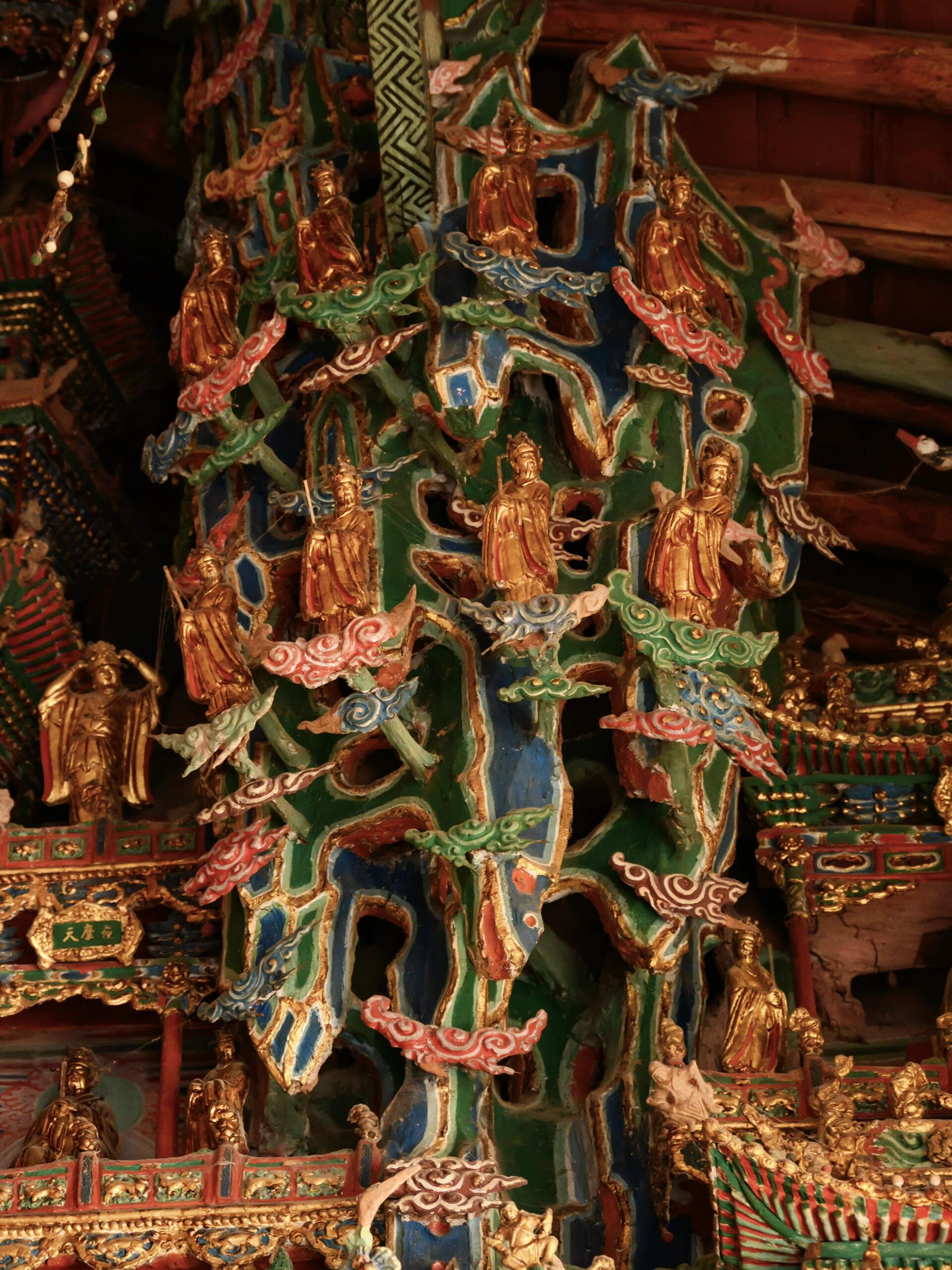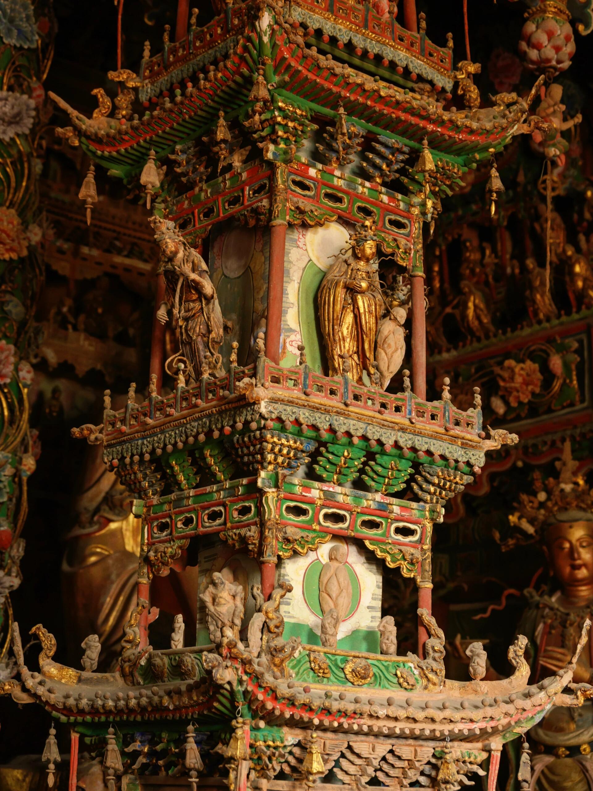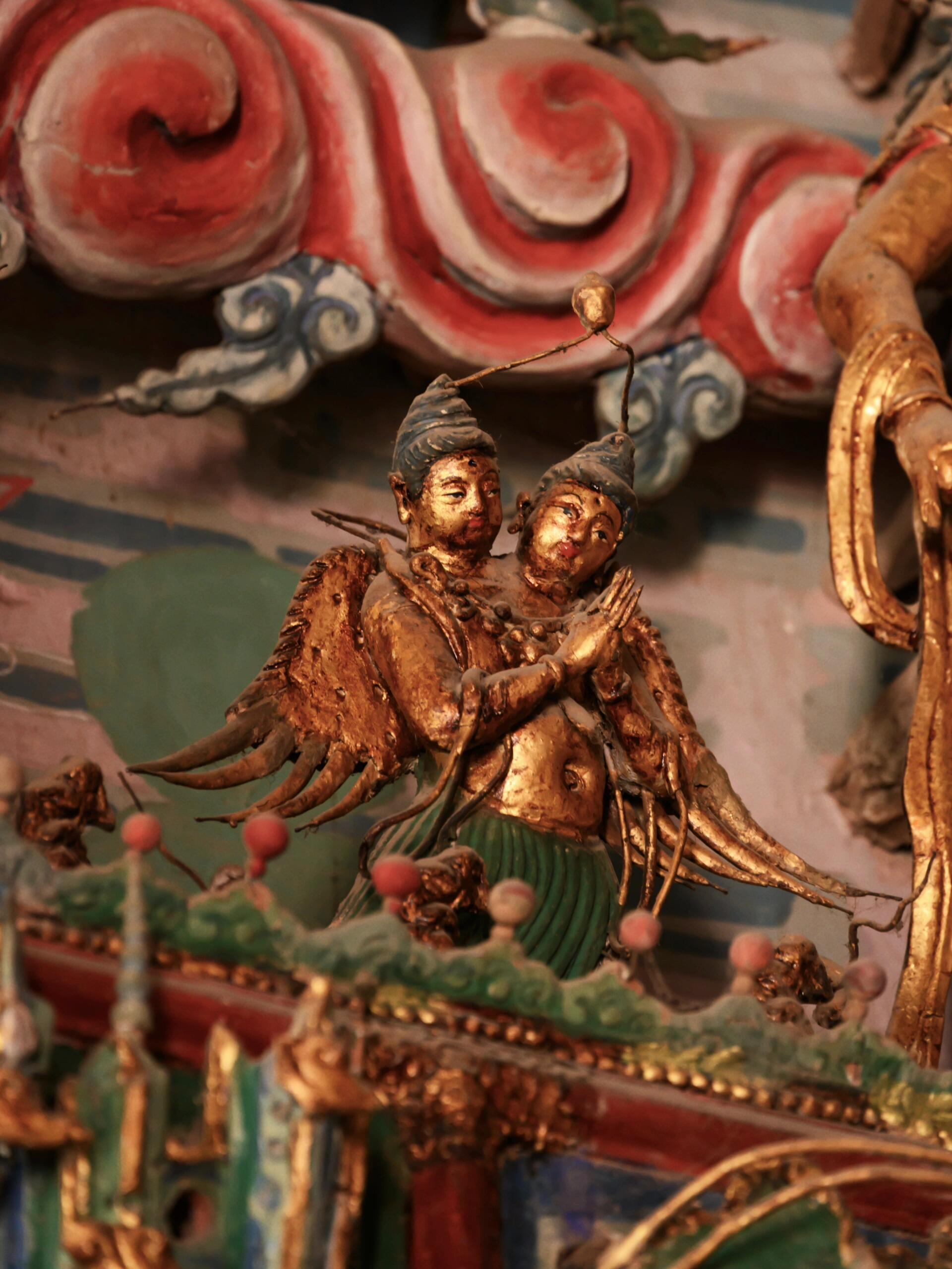 往北边墙根挪两步,六欲诸天的悬塑能让人忘了眨眼。这些半悬在空中的神像,最小的还没拇指大,却连睫毛都根根分明。东边那尊持国天王,铠甲上的鳞片竟是用蛋壳镶嵌的,阳光一照,泛着珍珠母的虹彩;西边的增长天王,手里的宝剑刻着缠枝纹,纹路里填的不是颜料,是掺了朱砂的糯米汁,四百年过去,红得像刚涂上去。最绝的是诸天脚下的云纹,看着是泥塑的,其实里面藏着细竹篾编的骨架,手指轻轻敲上去,会发出嗡嗡的空响。有修复专家说这是"悬塑的呼吸",可来写生的美院学生却觉得,更像无数细小的心跳声,挤在这方寸空间里。