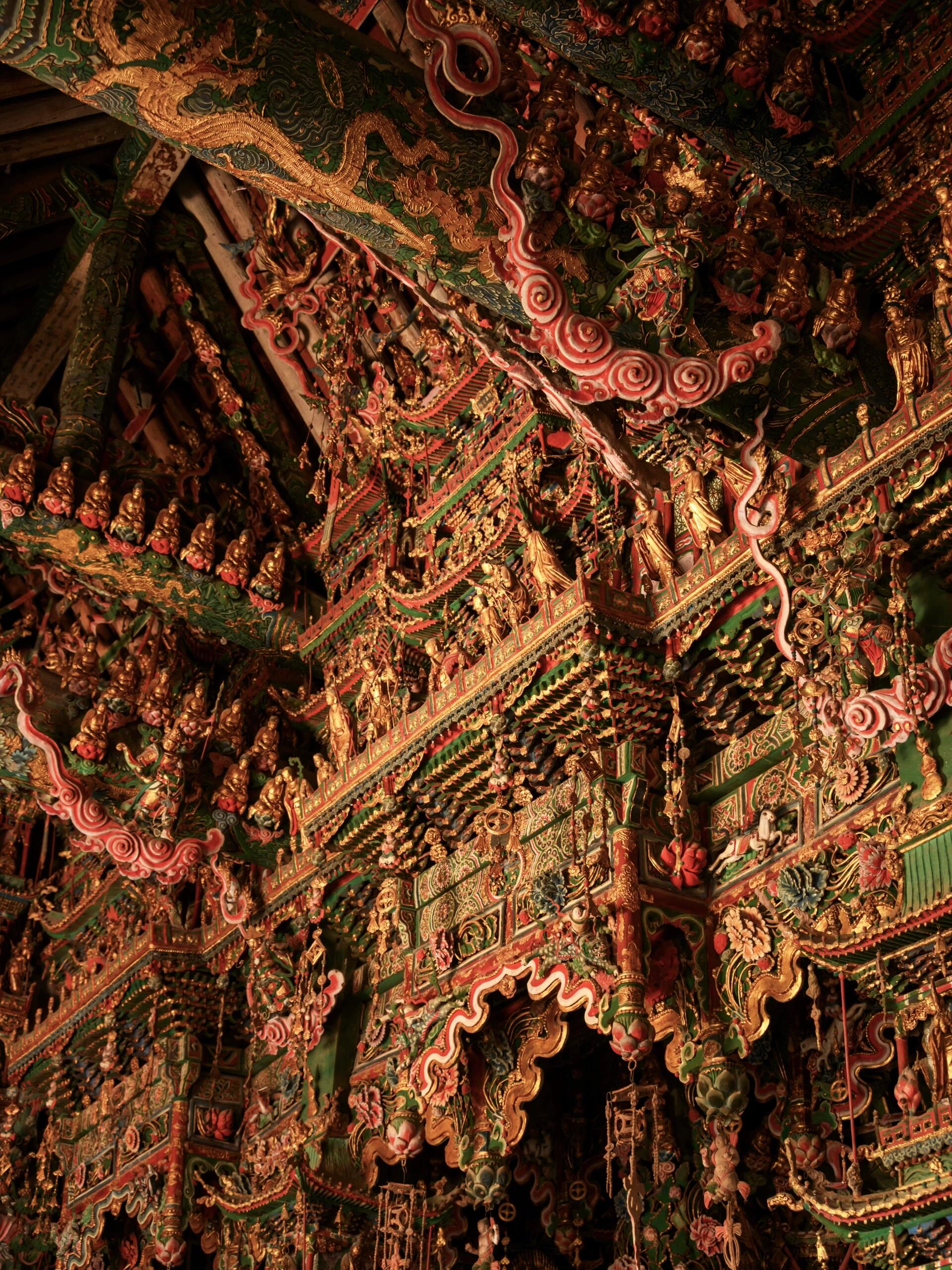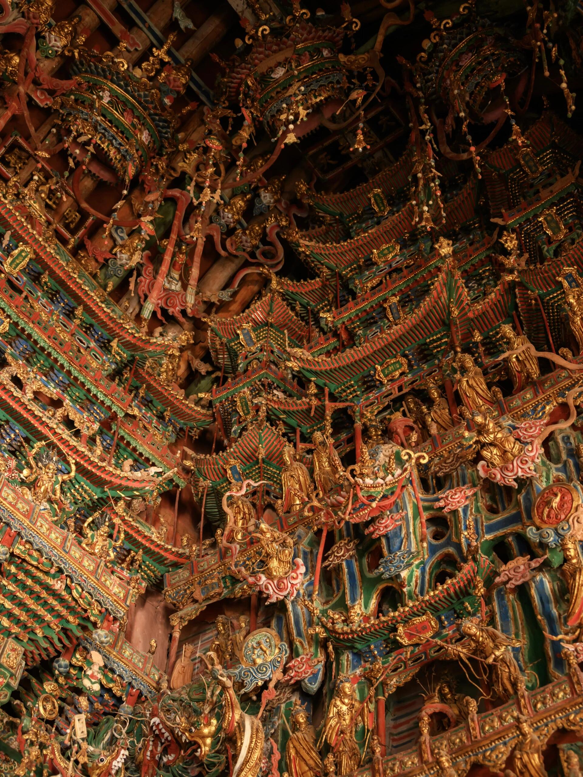 殿顶的藻井是另一场视觉风暴。不像别处寺庙的藻井规规矩矩分几层,这里的斗拱像炸开的烟花,一层裹着一层往上转,每个斗拱的角落里都坐着个小佛,有的在敲木鱼,有的在捧经卷,最顶上那个倒坐着,脸对着地面,像是在偷看香客。有人说这是"倒坐观音"的变体,暗喻"佛在心中,不在高处";可当地老人却讲过个笑话,说明代匠人嫌藻井太高不好雕,干脆让小佛倒坐着,"省得仰着脖子累得慌"。两种说法吵了小半年,直到有人用无人机从殿顶往下拍,发现所有小佛的目光其实都对着殿中央的蒲团——不管坐着站着倒着,终究是在看人心。